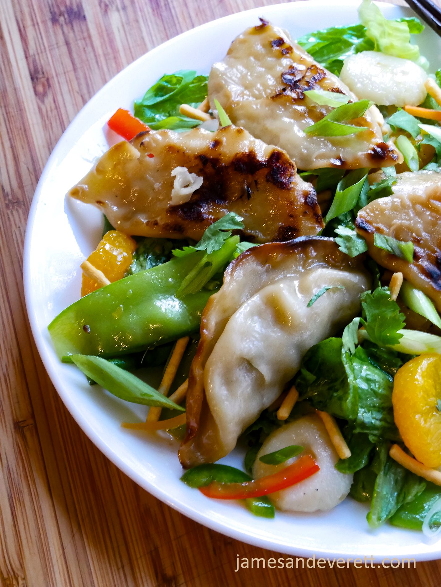 Fresh garden vegetables and mandarin oranges are tossed with an Asian sesame dressing then topped with warm pot stickers for this scrumptious salad.