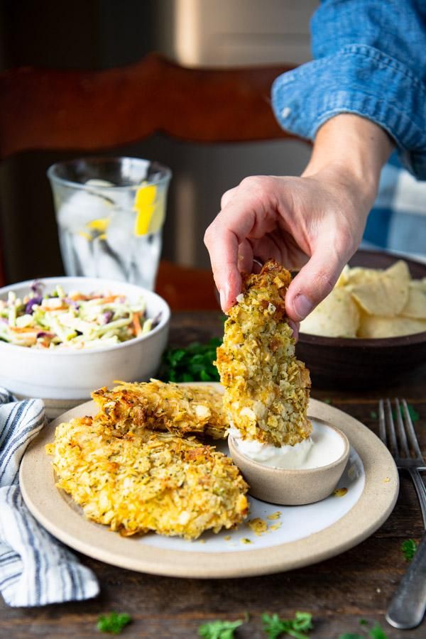 These crispy, golden brown, oven baked Potato Chip Chicken Strips are a quick and easy weeknight dinner! Everyone at the table will love the flavor of the sour cream and onion potato chip crust on tender, juicy chicken breast tenders. Serve them with ranch, honey mustard, or ketchup for dipping, plus a salad or other green veggies on the side.