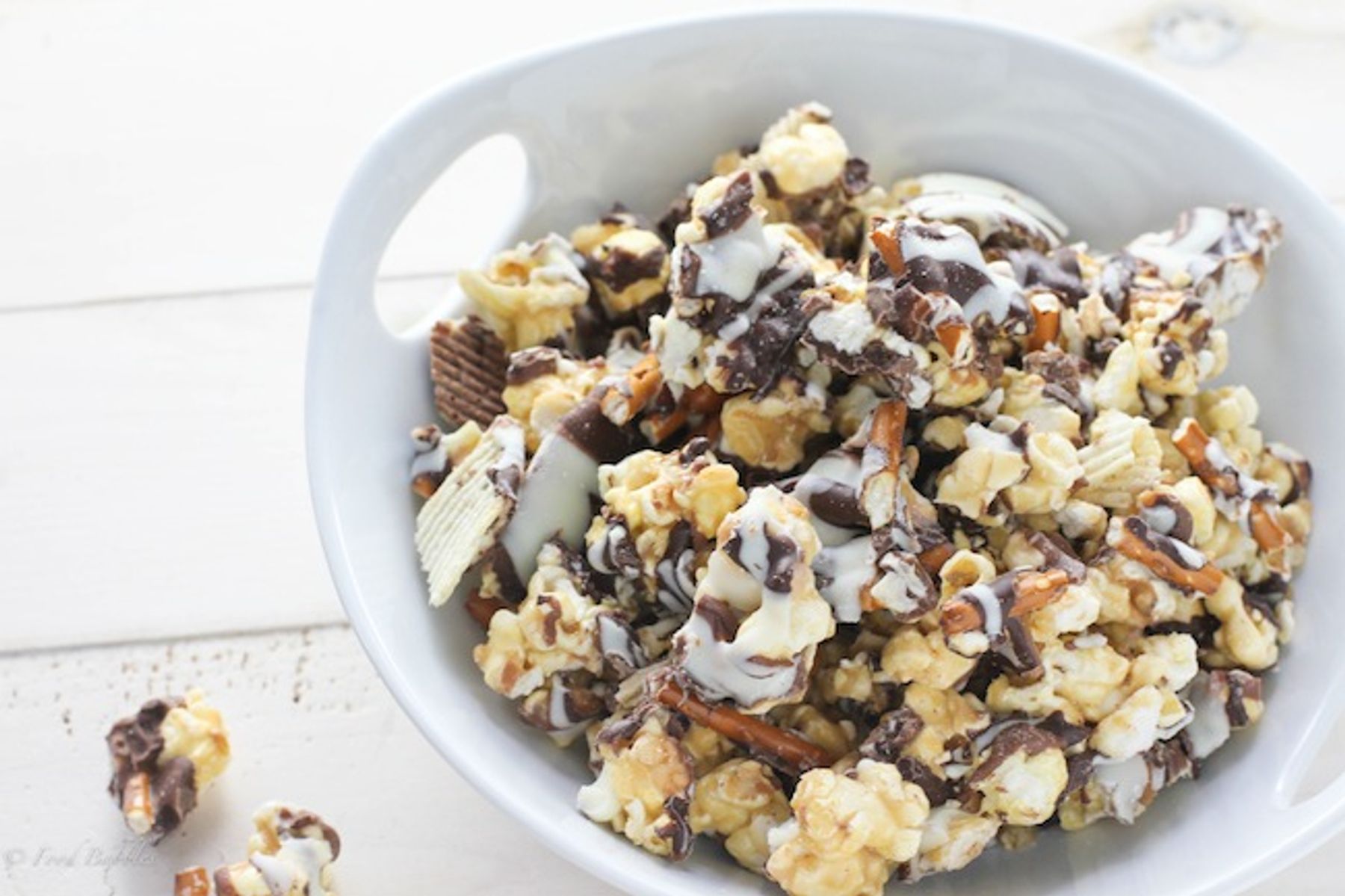 Buttery caramel corn tossed with pretzels, potato chips and two kinds of chocolate for the ultimate snack food.