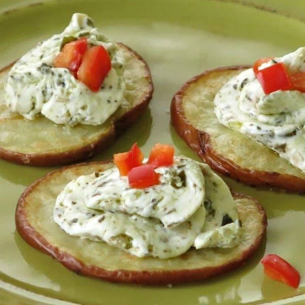 Potato "crostini" rounds with Pesto Cheese combines 5 ingredients into a scrumptious appetizer or side dish! Easy, gluten-free recipe!