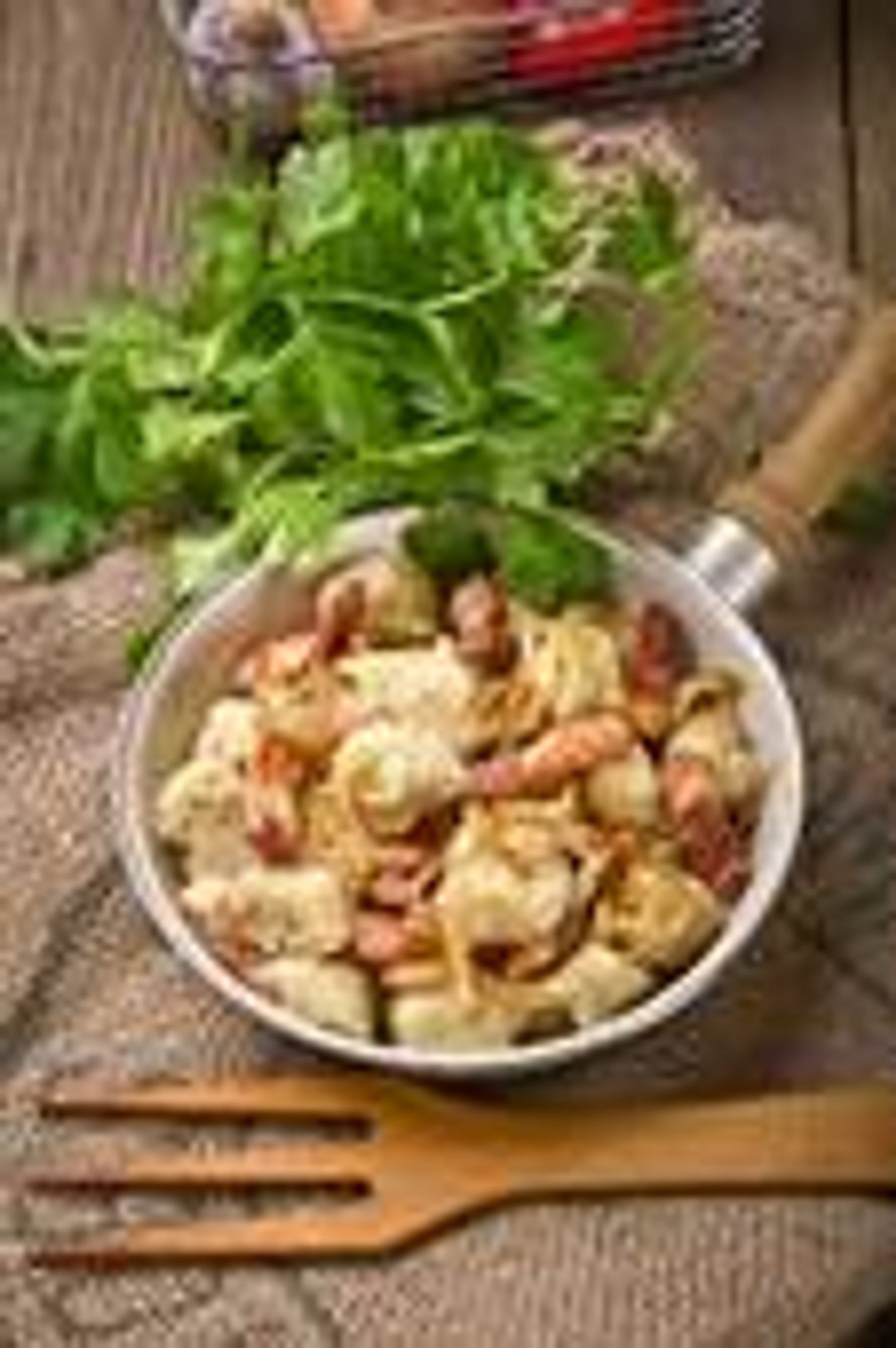 Rub the hot potatoes through a ricer or sieve. Mix with the egg, seasonings, hot milk and 2 oz. grated cheese to a smooth paste. Put oil in a cup, enough to cover the spoon you will be shaping dumplings with. Dip spoon into oil then in the potato mixture to form dumplings, drop into a large pot of boiling water and cook until they rise to the top. Drain well, then the dumplings should be plated on a hot plate and sprinkled with the rest of the cheese. Lightly brown the butter, fry the onion rings with the breadcrumbs and pour sizzling over the dumplings.