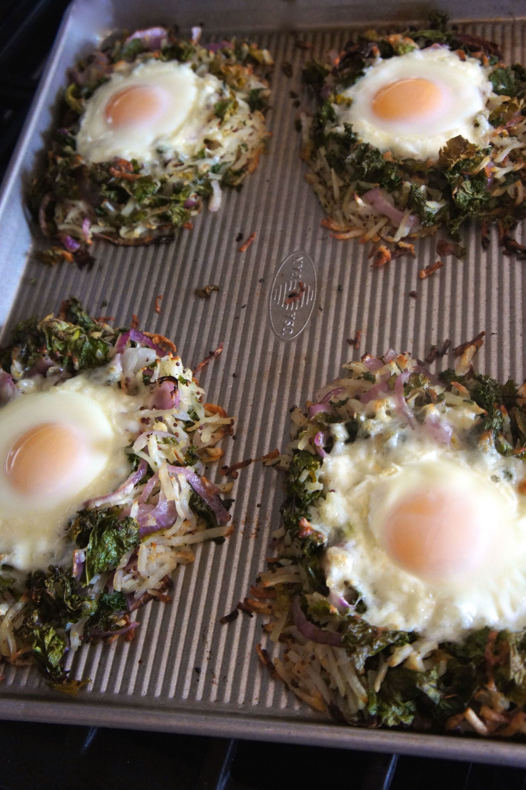 In a large bowl combine the hash browns, onion, garlic, oil, mustard and pepper. Spread evenly onto...