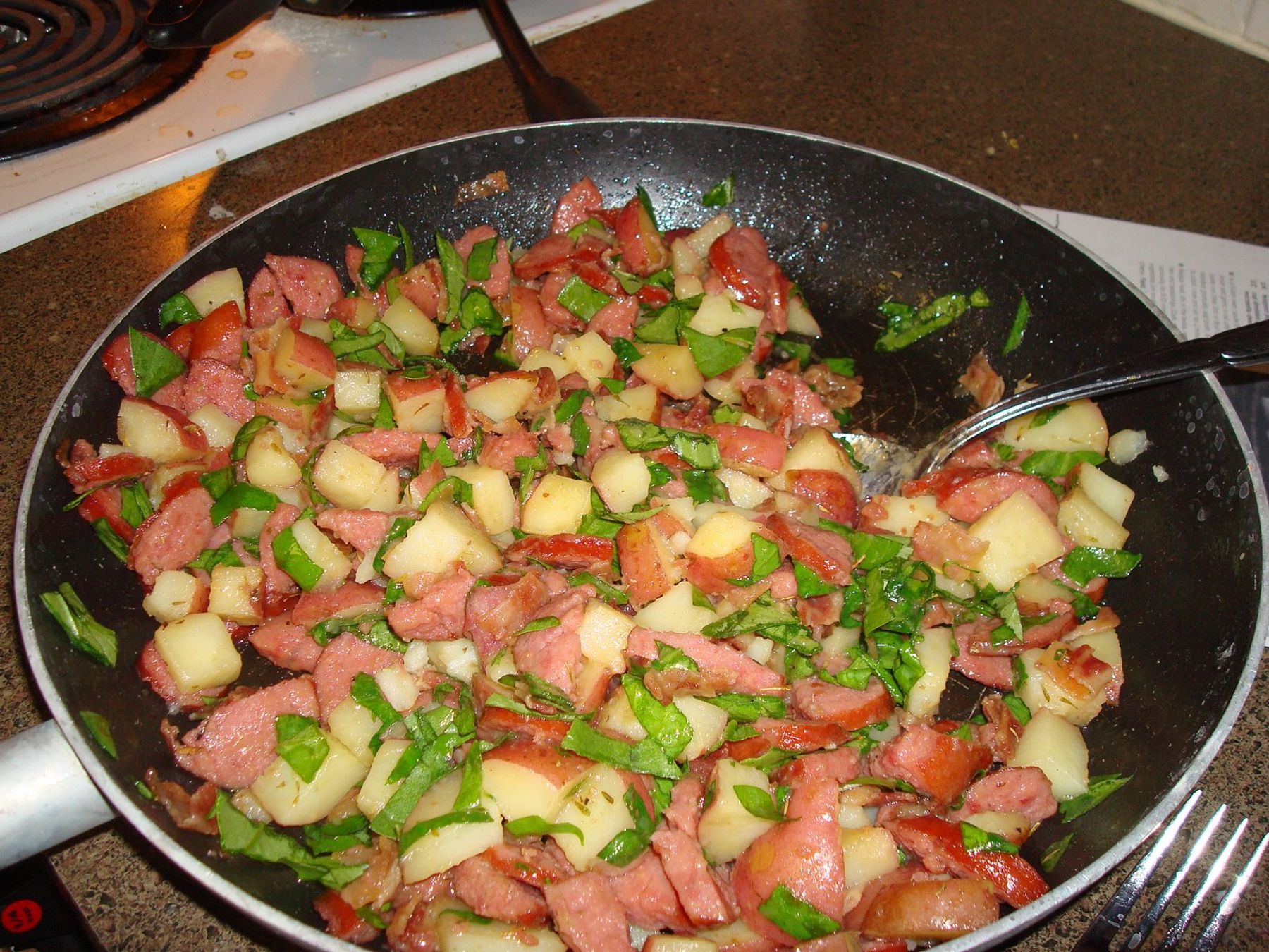 Add potatoes; saute 3-5 minutes more or until sausage and potatoes are lightly browned.