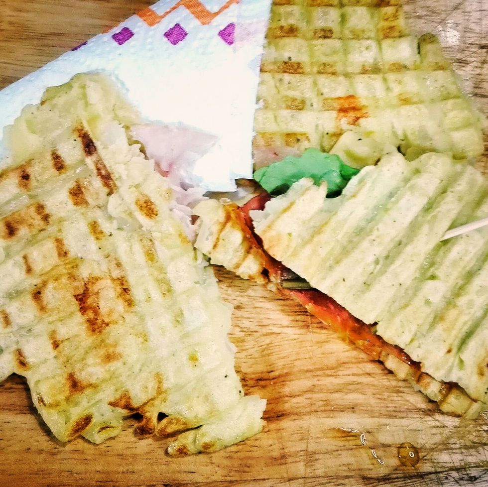Slice 500gr of potatoes, put them in a bowl and add a chopped little onion. Mix and add 2 eggs, 150ml of milk, salt, pepper and nutmeg and stir. Then add 120gr of flour. Mix it. Preheat a sandwich maker or...