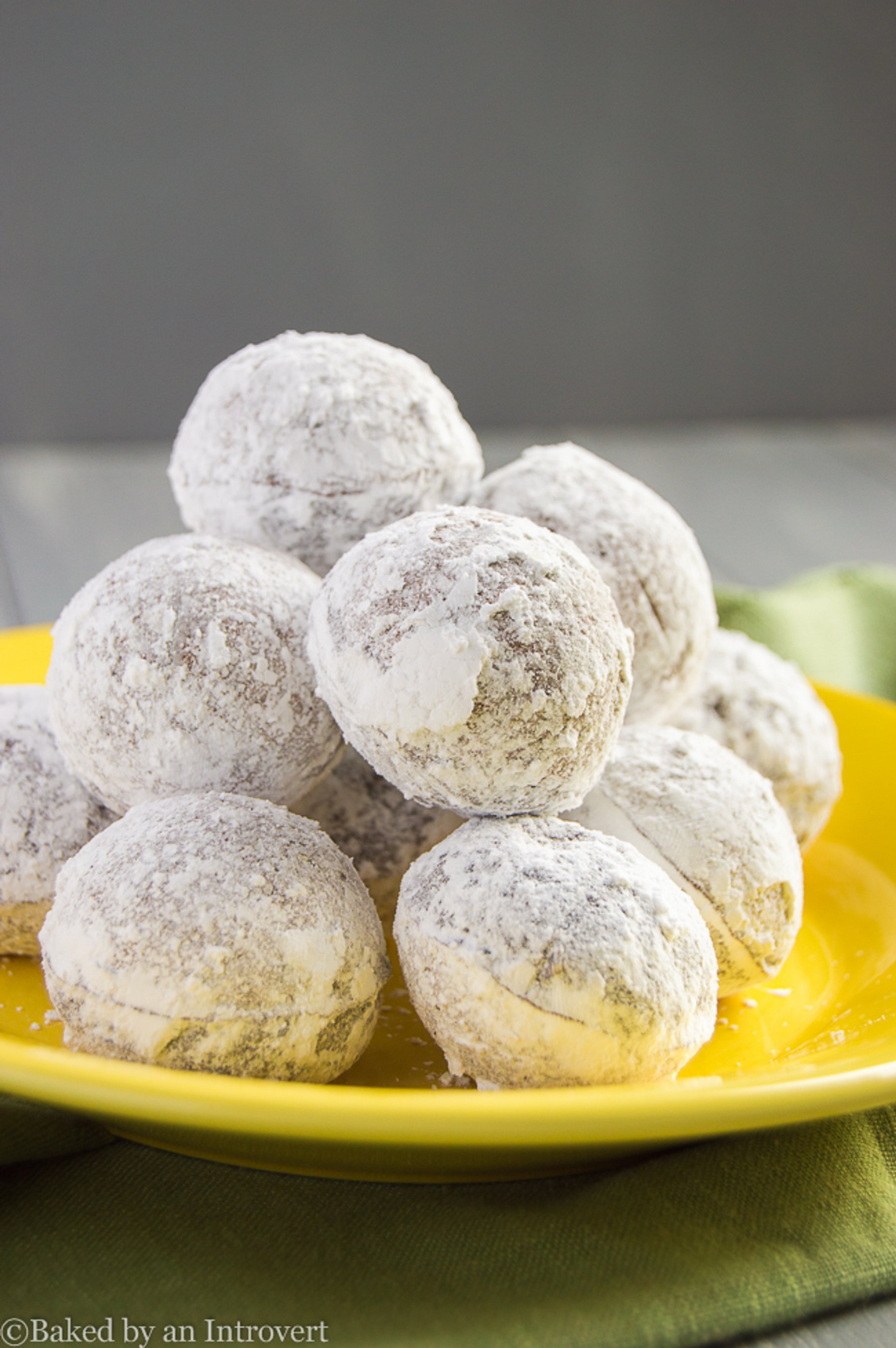 Moist, baked chocolate donut holes coated with powdered sugar.