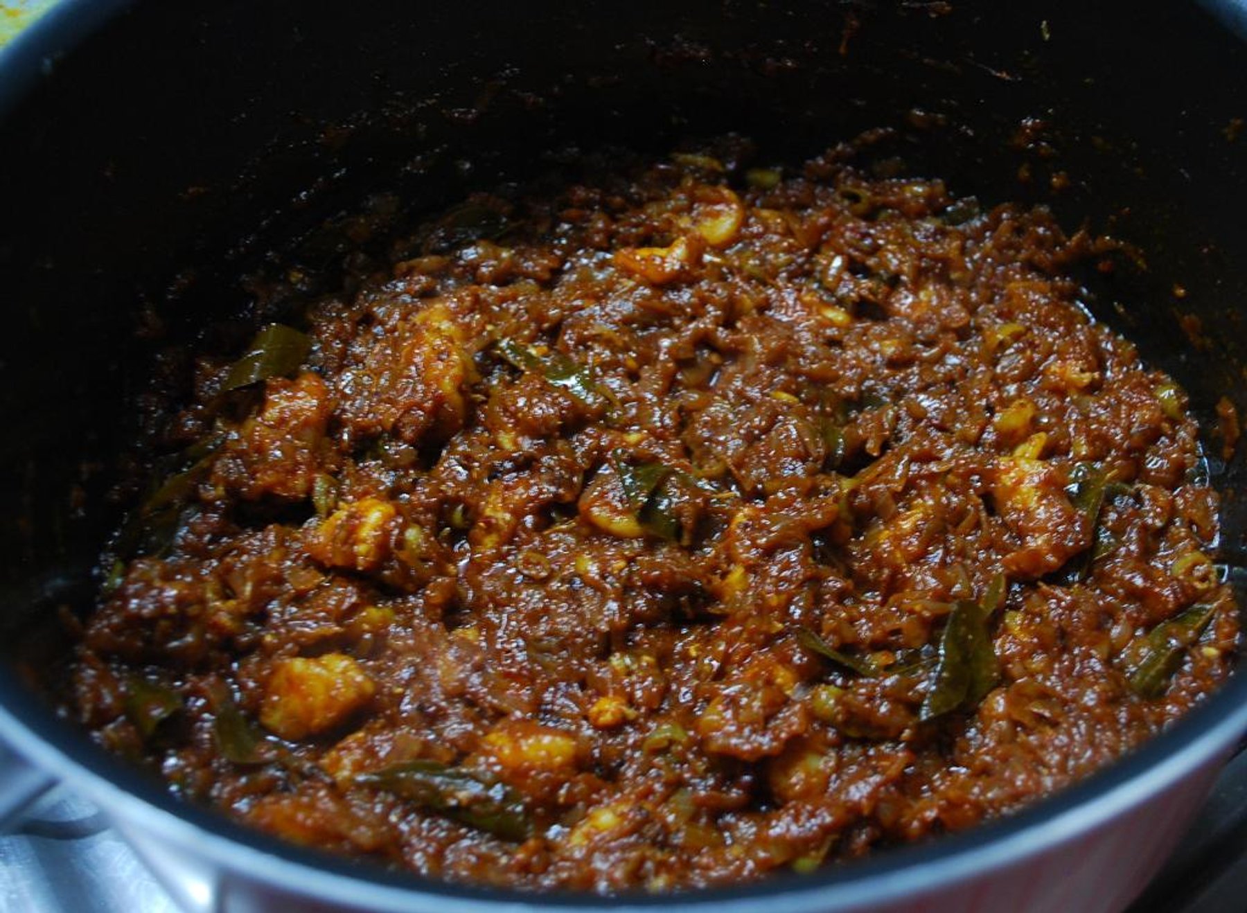 Now add the spice-vinegar paste, sugar and salt to taste and fry till the oil begins to separate.