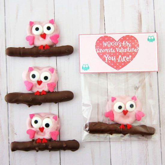 Whoooo wouldn't want these cute Pretzel Owls? Each chocolate dipped mini pretzel twist is decorated with heart sprinkles and made with love!