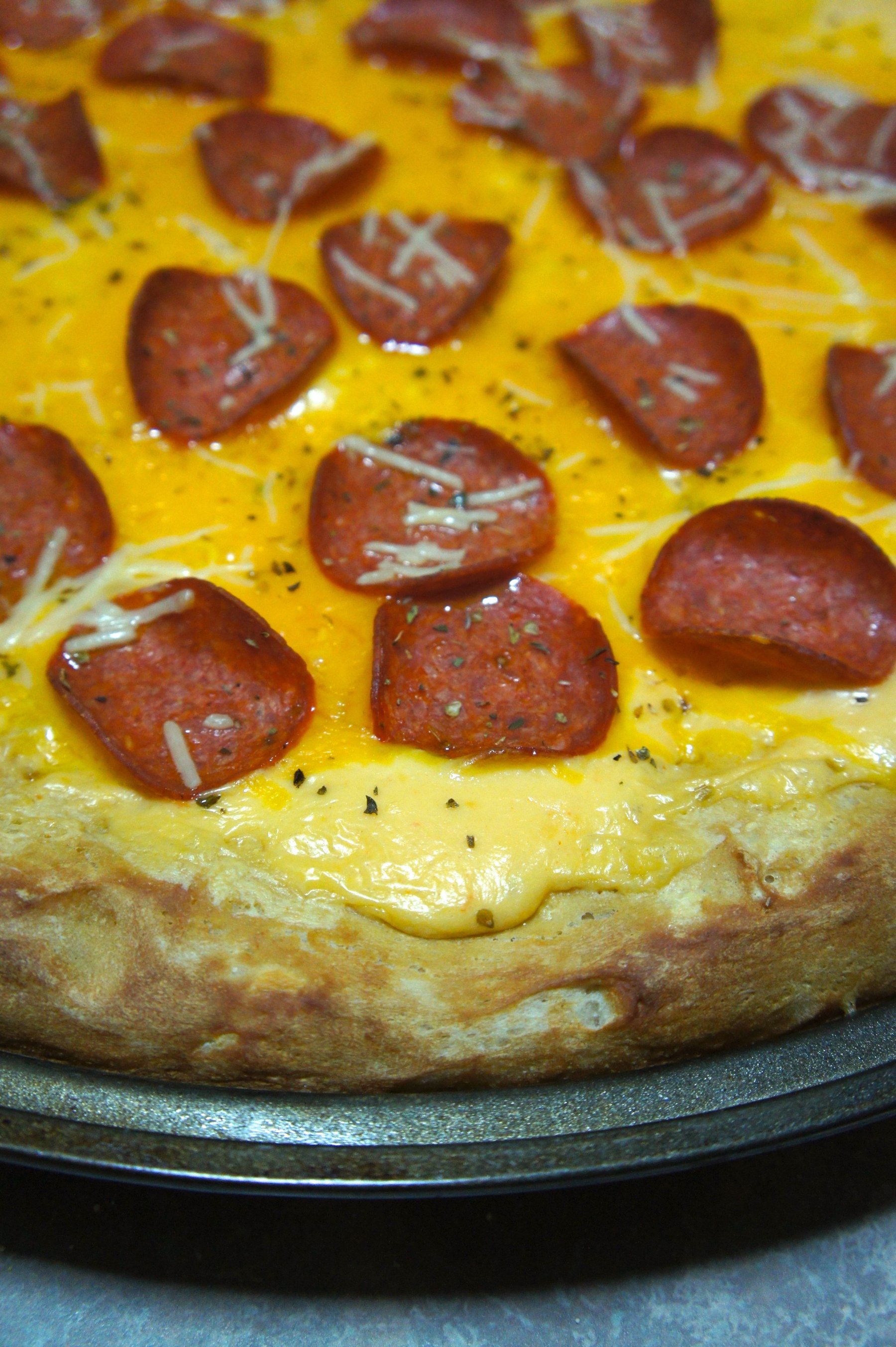 A pretzel crust pizza topped with a cheese sauce, cheddar cheese and pepperoni.