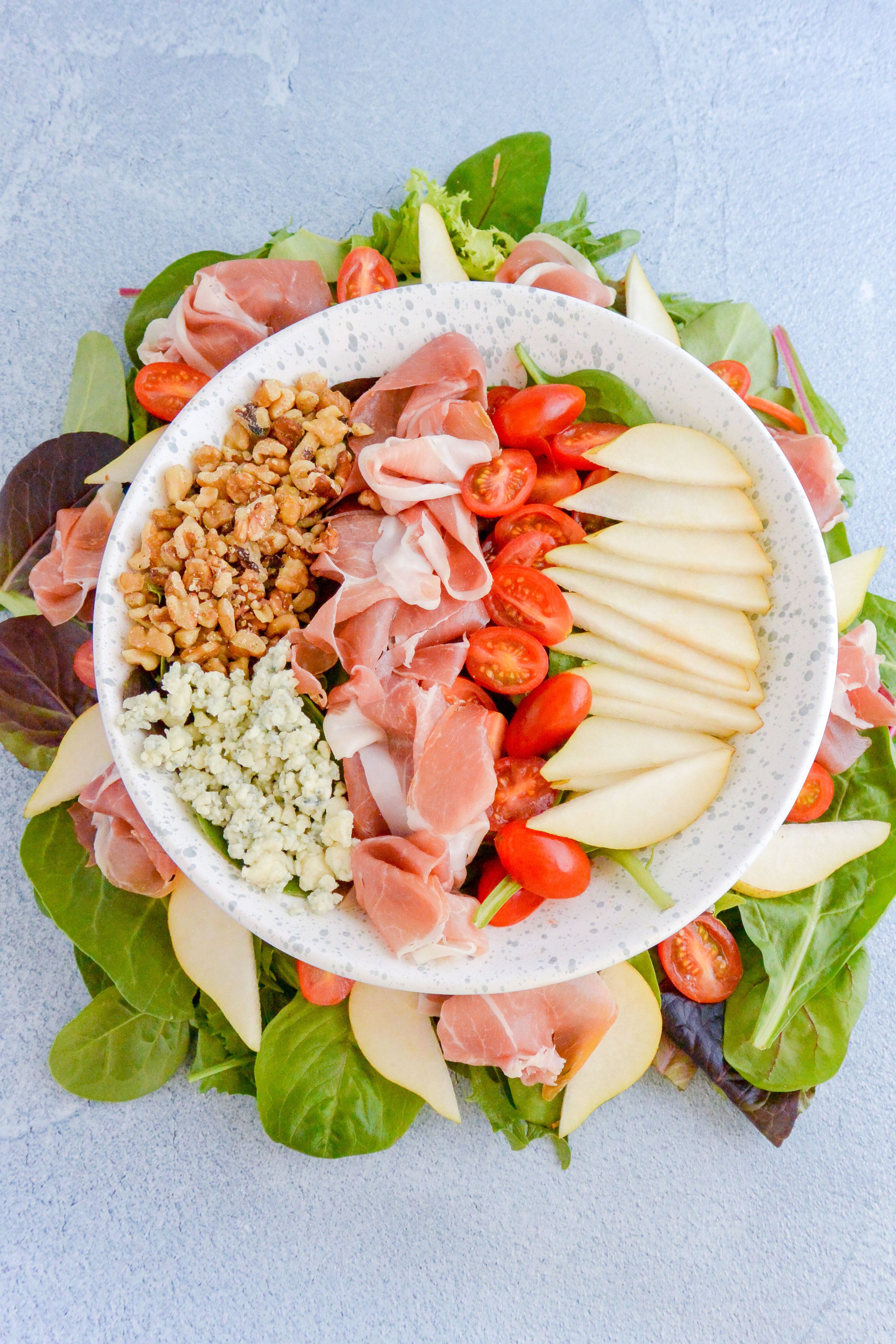 This classic cobb salad has been upgraded to a Prosciutto Cobb Salad with freshly sliced pears and prosciutto. Together, they bring light and bold flavors that really uplifts a traditional salad.