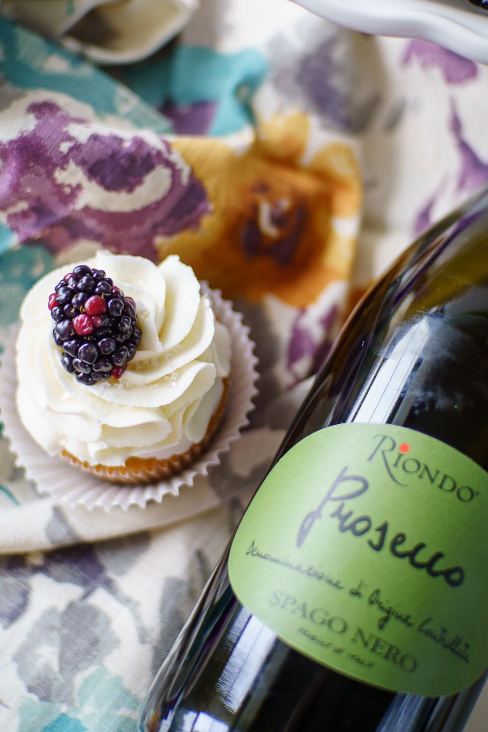 These cupcakes feature a Prosecco cake batter, a dollop of blackberry compote inside, and are frosted with a Prosecco icing.