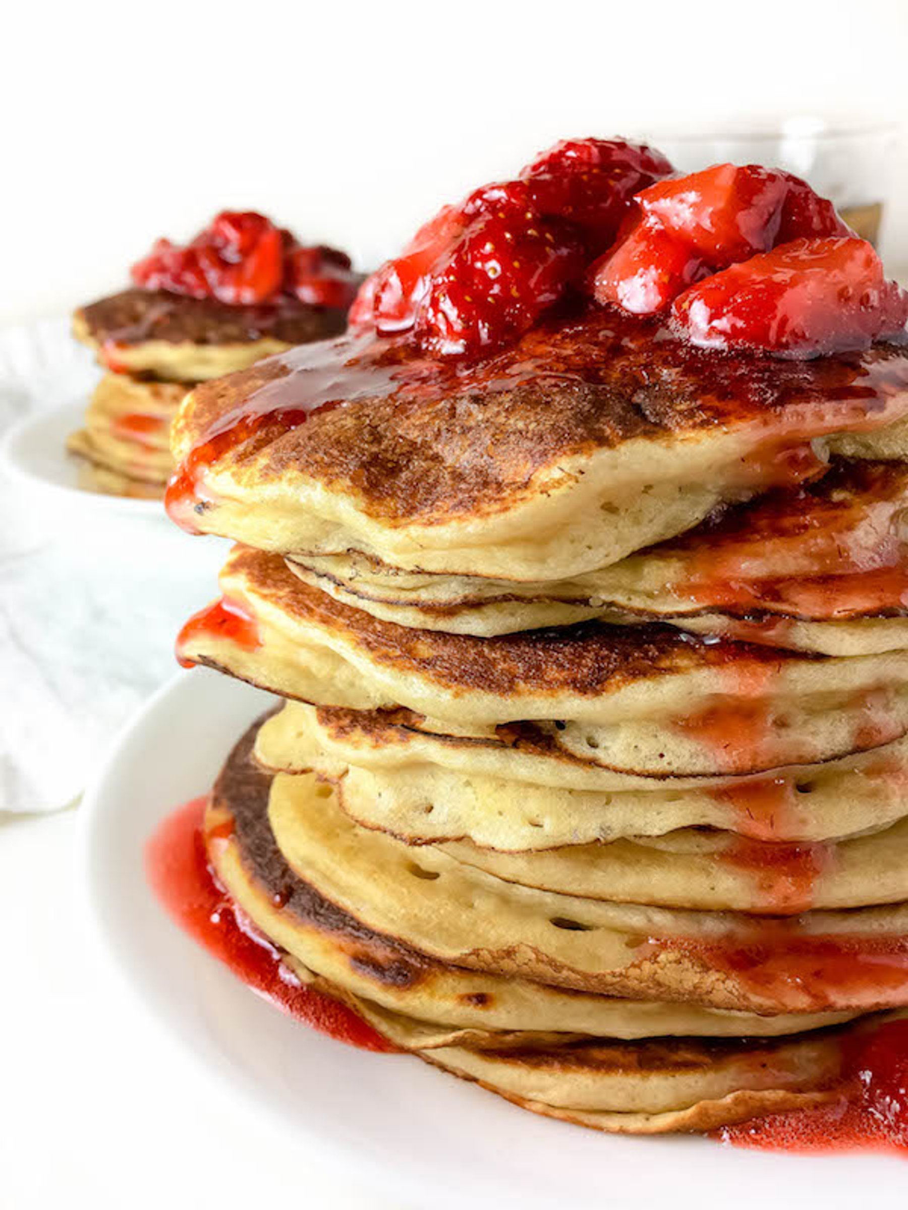Light and fluffy Protein Pancakes with Strawberry Syrup – made with whole wheat flour, protein powder, and no refined sugar.
