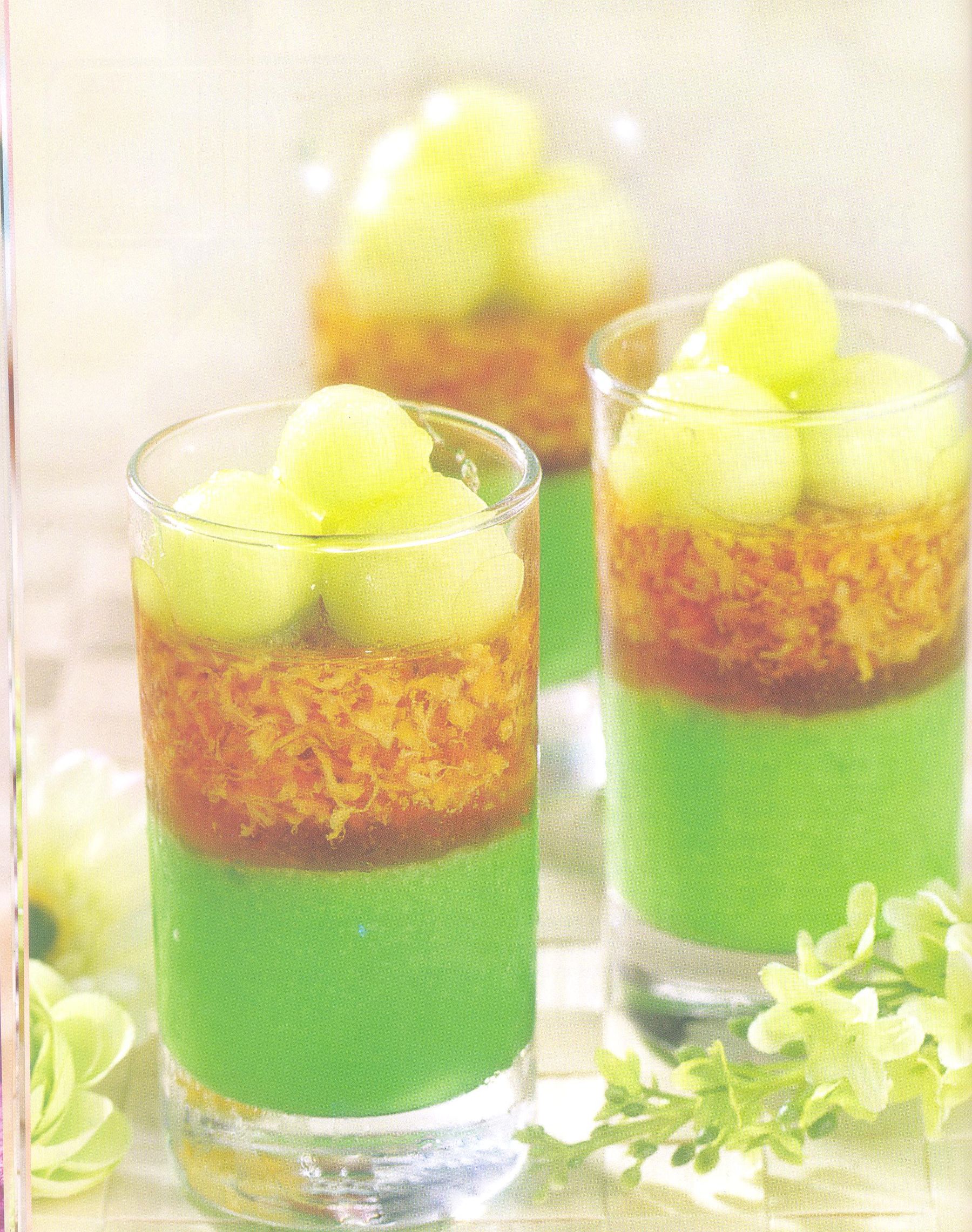 Melon pudding : cob jelly powder , sugar , and water to the boil