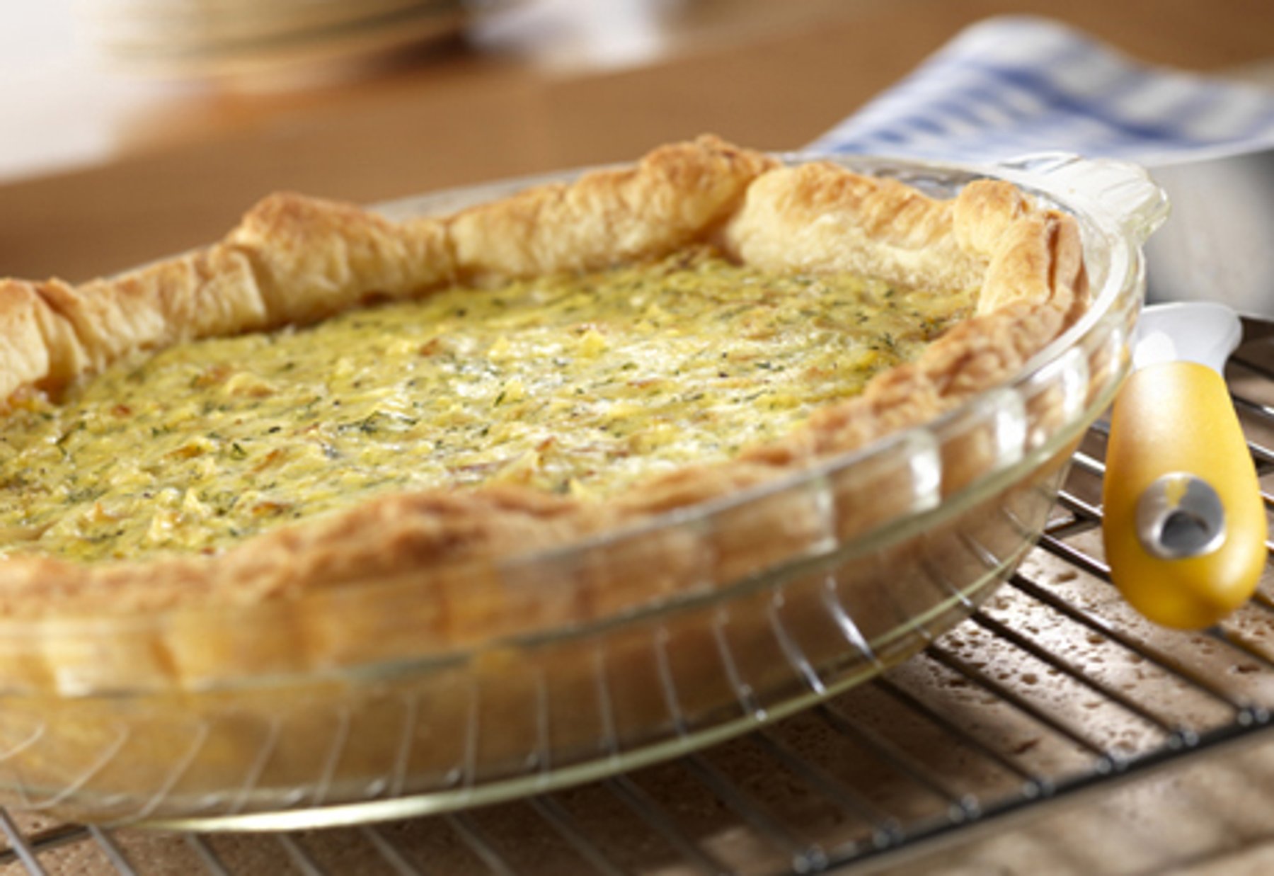 Here's an delectable, meatless main dish—puff pastry sheets and frozen hash browns make it easy...Swiss cheese, onions and dill make it really delicious.