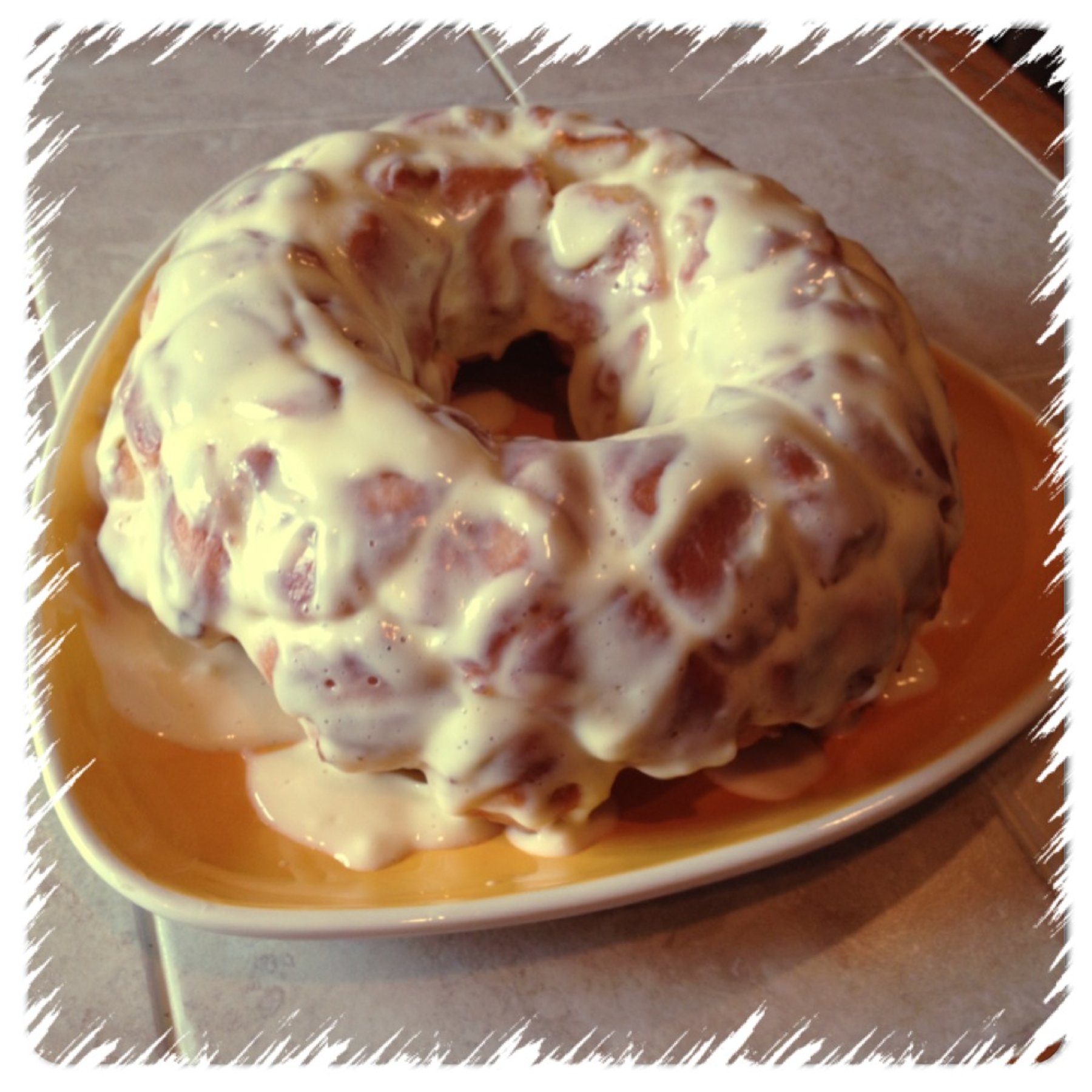 22. Pour glaze onto hot cinnamon bundt cake.