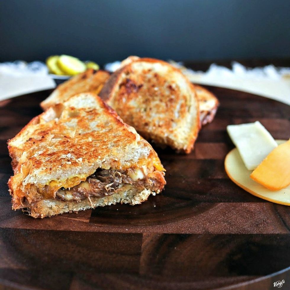 Pork, 3 types of cheese and sourdough bread combined in a sandwich of melted goodness