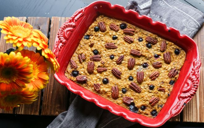 Made with pumpkin and blueberries, this delicious baked oatmeal will warm you on those cold mornings and give you a great start to your day!