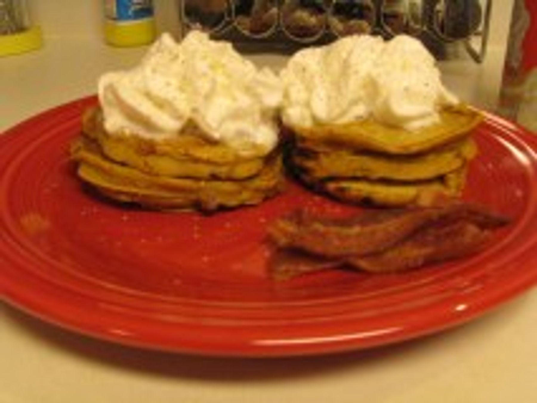 When the changing of summer to fall has officially happened, I take that as my cue to break out the pumpkin recipes. And, if there’s not a pumpkin variation available, I make one up as I go along. So far this improvisation has worked deliciously and last night’s pancake recipe modification was no exception. It seems as though pumpkin season is too short for a lover like me, so I have to get my fill between now and Christmas, before all things pumpkin magically go “poof!”