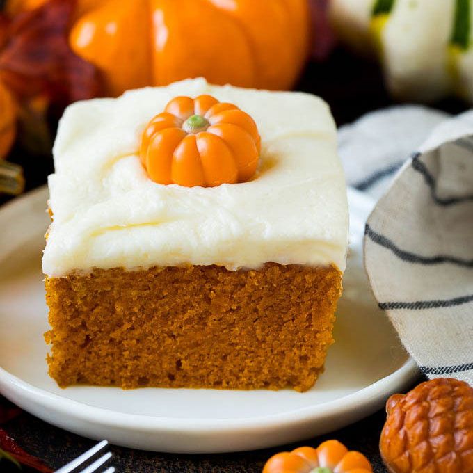 https://www.dinneratthezoo.com/pumpkin-cake/This pumpkin cake is filled with plenty of pumpkin puree and spices, then baked and topped with a generous amount of cream cheese frosting. The ultimate fall treat that's perfect for gatherings and makes for a show stopping dessert on Thanksgiving day.
