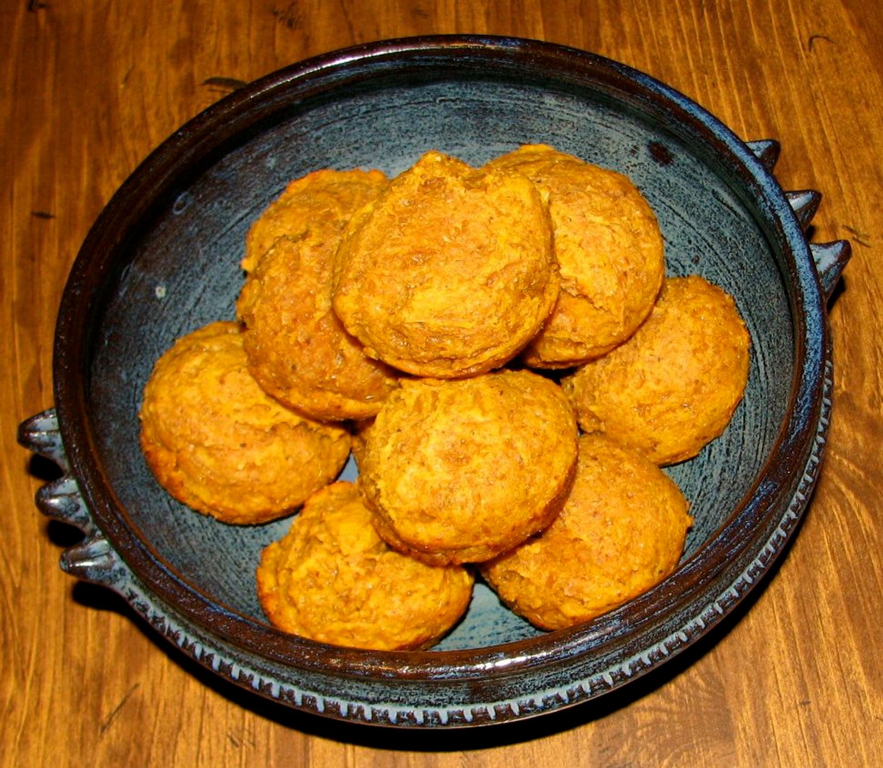 I will admit, when I saw this recipe for the first time I was not sure it would work. Pumpkin? With Cheddar? And cayenne? And brown sugar? Let me assure you, IT WORKS! They are sweet, spicy and cheesy and the perfect accompaniment to anything or alone as a breakfast item! I love to serve them with minestrone soup but they would be a great addition to your Thanksgiving table too. Make a double batch if you have house guests and they can eat them for breakfast with an egg and a couple of s