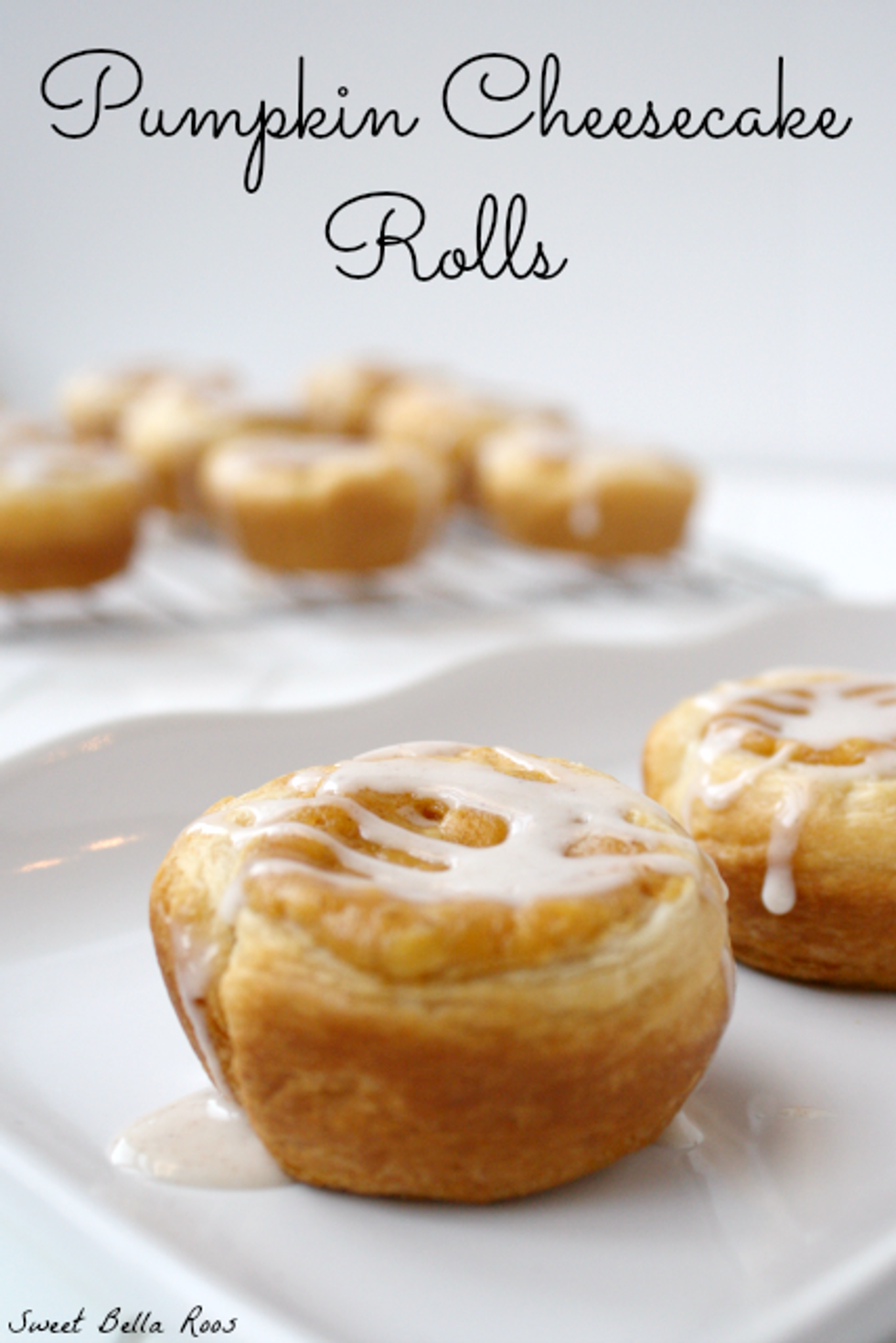Beat the cream cheese and sugar until fluffy. Gently mix in the egg yolk, vanilla, pumpkin pie spice, and pumpkin pie filling. Prepare the crescent rounds by taking them out of the tube (do not unroll...
