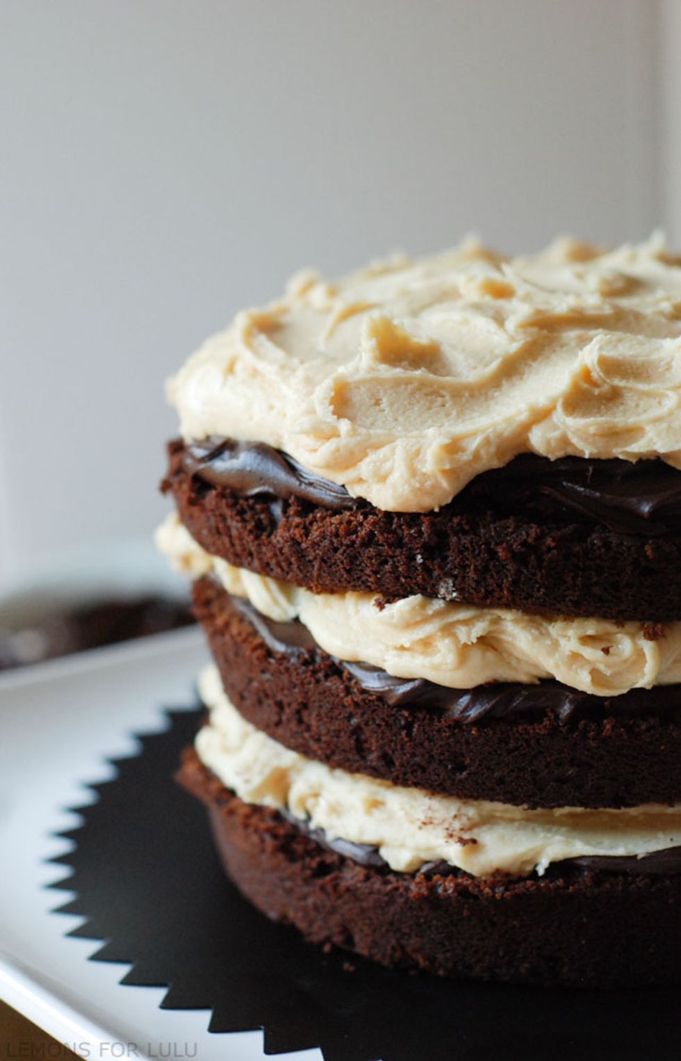 A pumpkin chocolate cake recipe filled with chocolate ganache and topped with a sweet caramel buttercream!