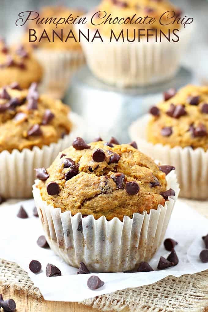 Pumpkin Chocolate Chip Banana Muffins: Made with both pumpkin and banana, and studded with mini chocolate