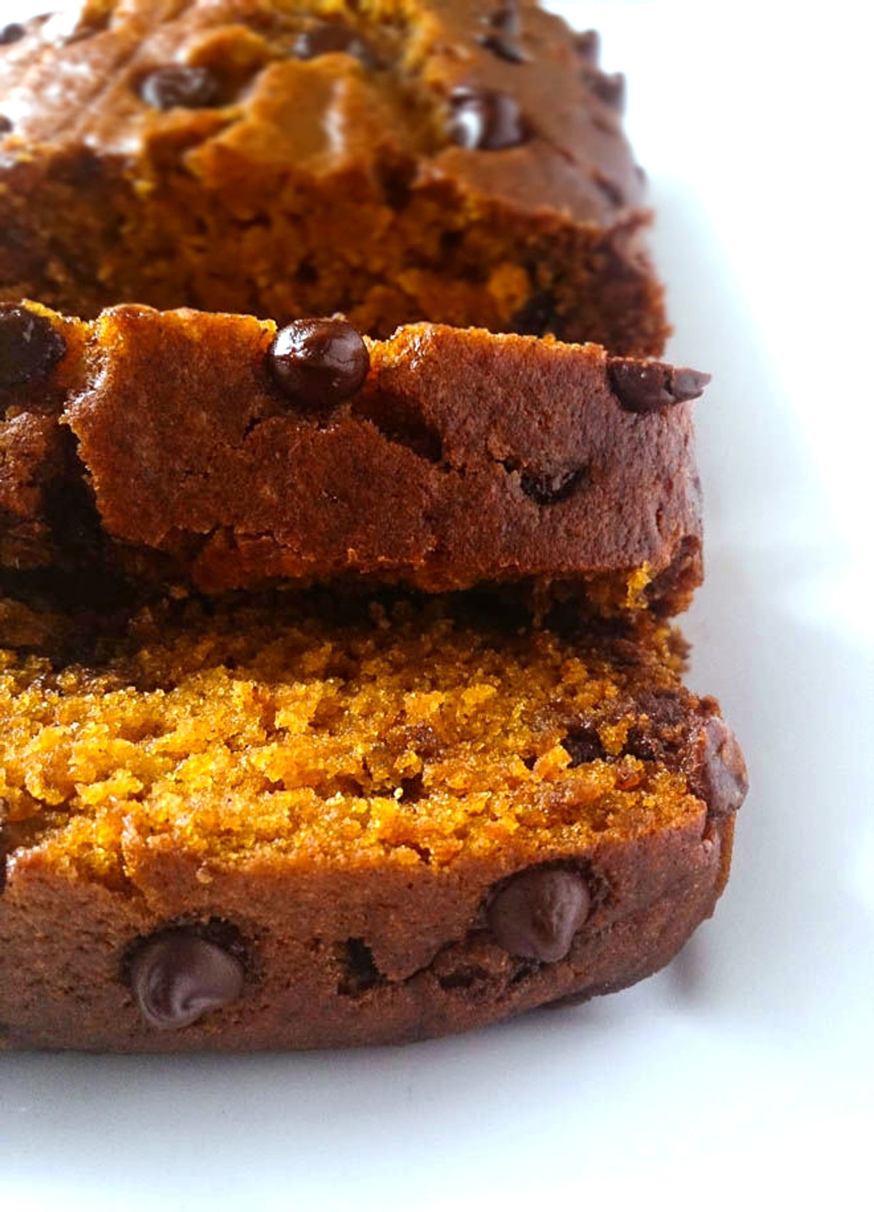 Deliciously moist and tender spiced pumpkin bread loaded and dotted with chocolate chips!