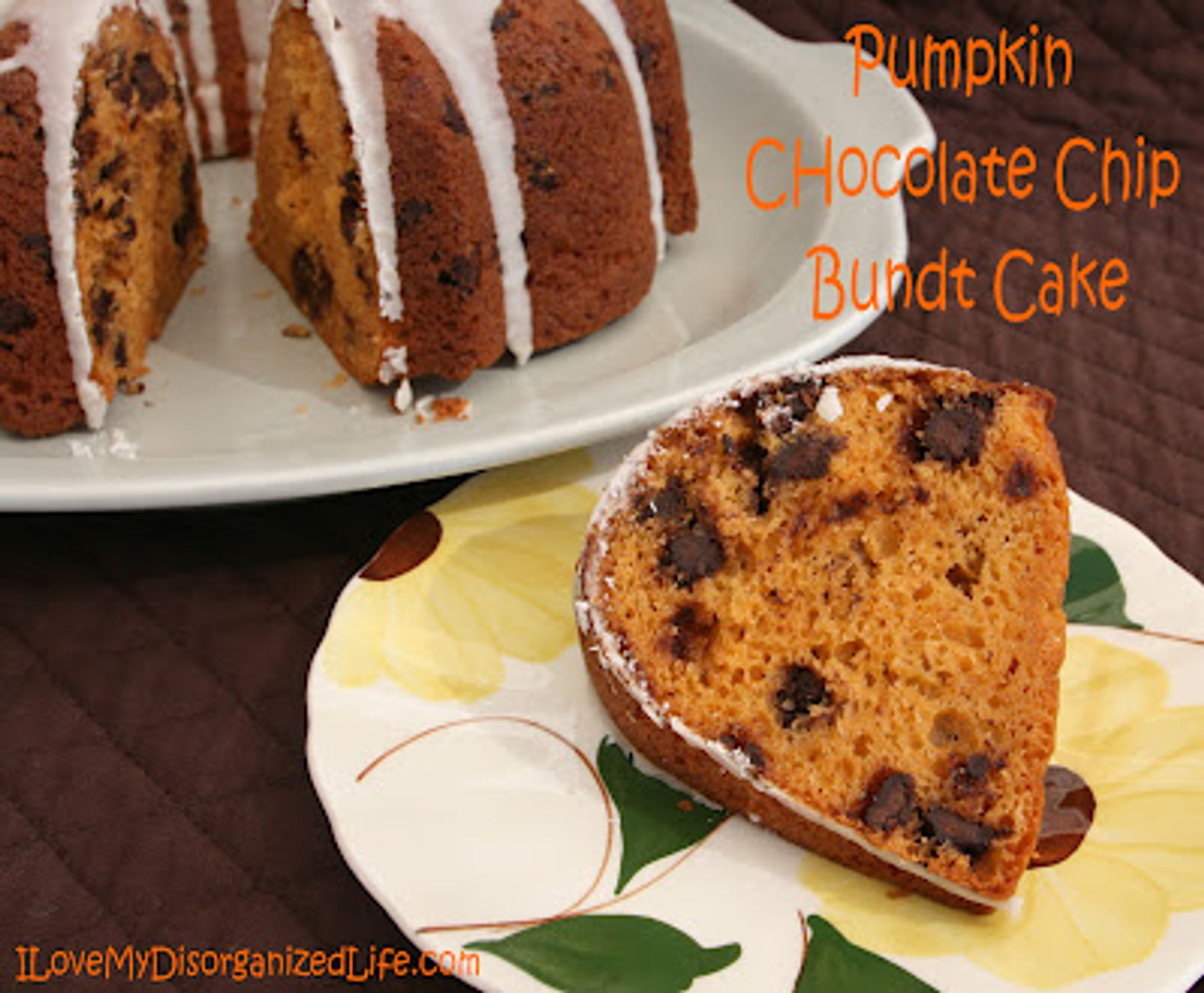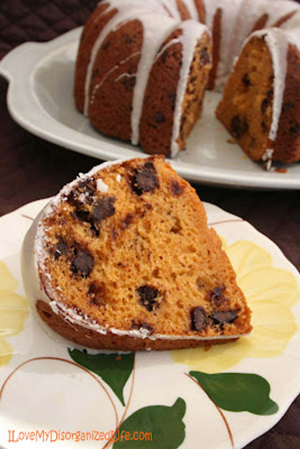 Preheat oven to 350*. Spray Bundt pan with Baker's Joy or Pam with flour. Combine the first five ingredients. Batter will be thick. Fold in chocolate chips. Pour into prepared pan. Bake for 45 min. Check...