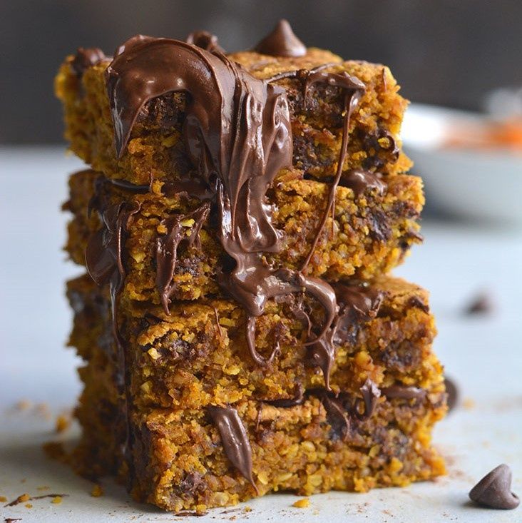 Pumpkin Chocolate Chip Cookie Bars are made with healthier baking ingredients for a better for you baked treat! Gluten free, lower in sugar and absolutely delicious! Vegan + Low Calorie + Gluten Free
