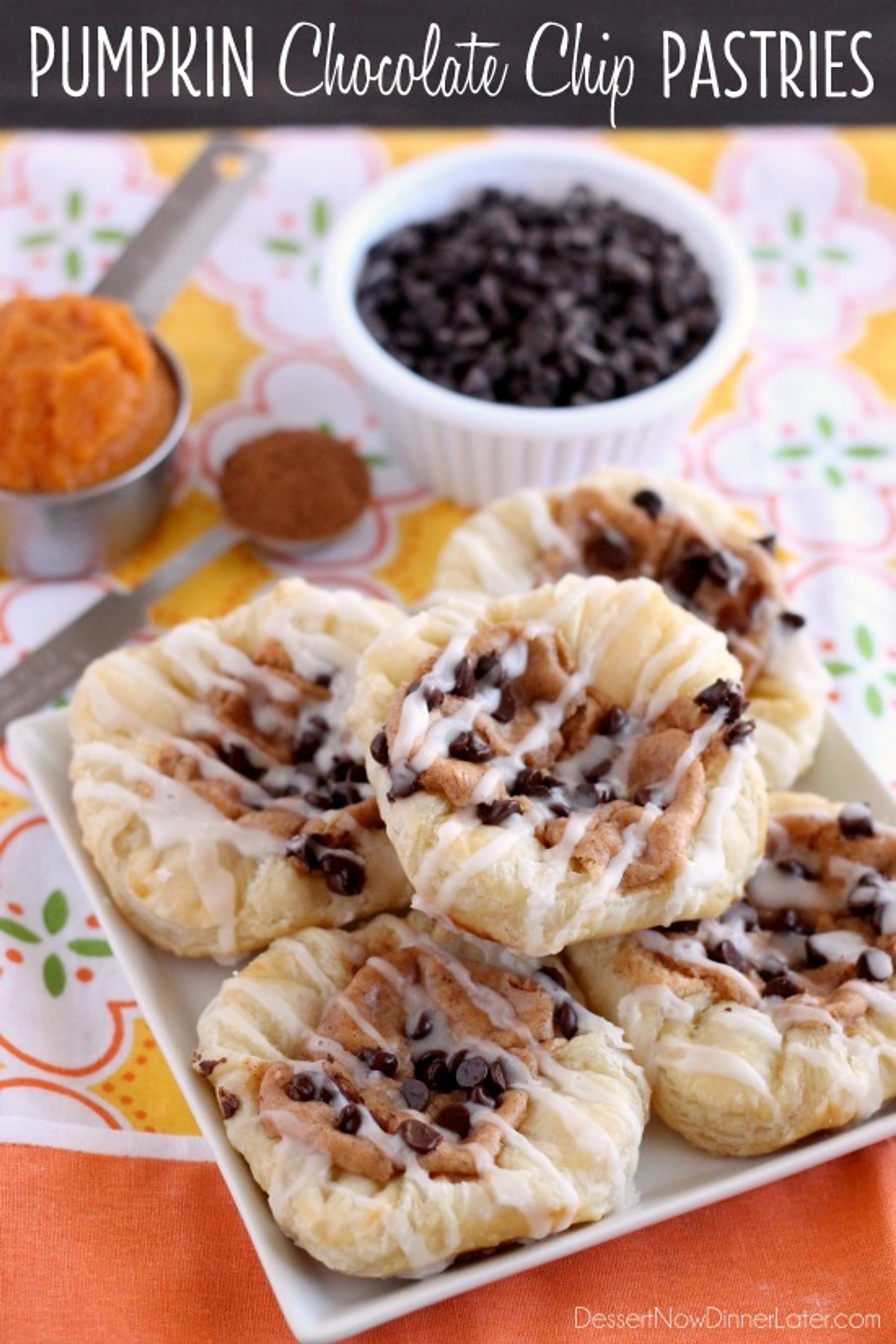Pumpkin Chocolate Chip Pastries are made with frozen puff pastry dough, a spiced pumpkin cream cheese, and mini chocolate chips! They are especially delicious warm from the oven with a powdered sugar glaze!