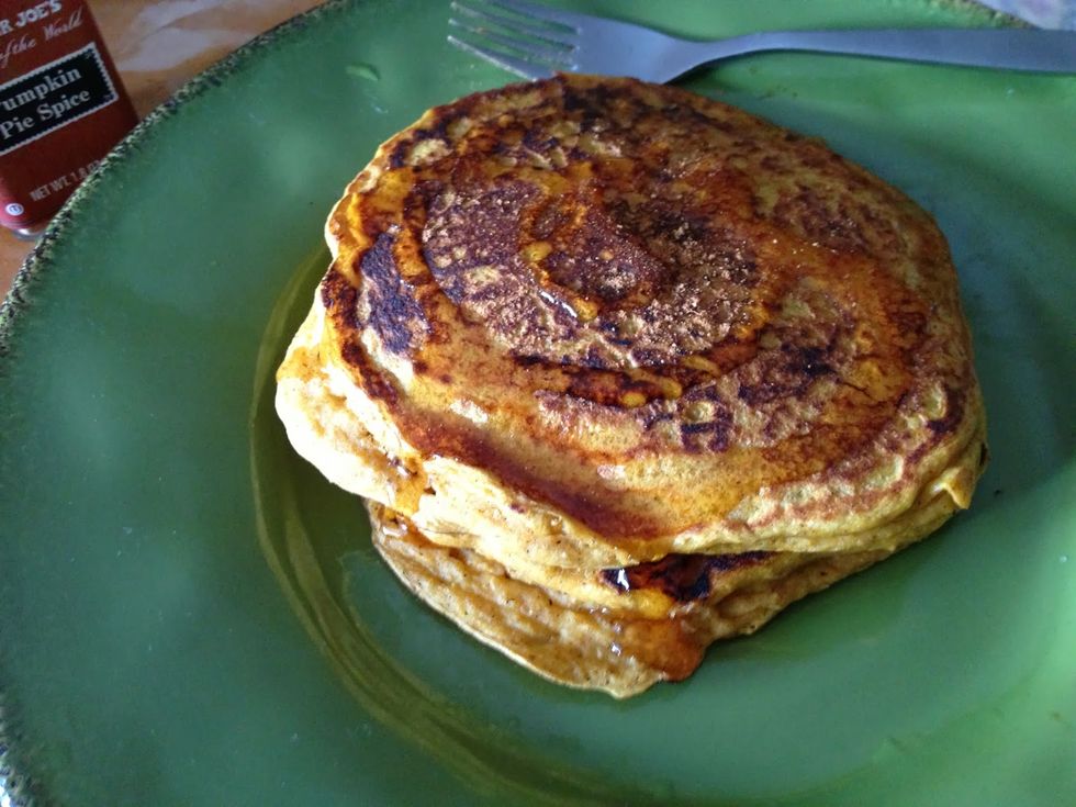 Joey always makes the pancakes. We used to have pancakes and eggs every weekend, and Joey would make the fluffiest buttermilk pancakes (from a mix) ever. He also usually handled the eggs, and I would take care of making the veggies for our eggs, and maybe getting coffee prepped. We finished off our giant bag of pancake mix from Sam's Club, and haven't bought any since. Joey decided to make me pumpkin pancakes, to finish up our Thanksgiving cooking. He found the recipe himself, and I re