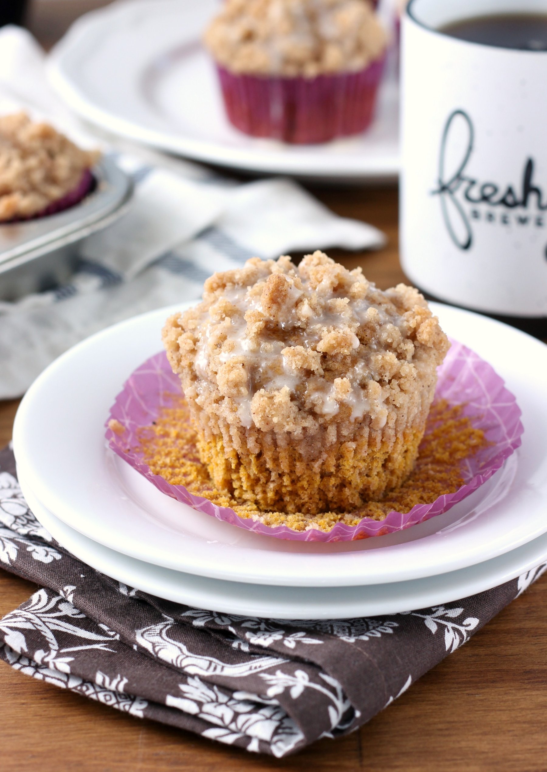Super easy pumpkin muffins topped with a rich, brown sugar crumble and sweet maple glaze!