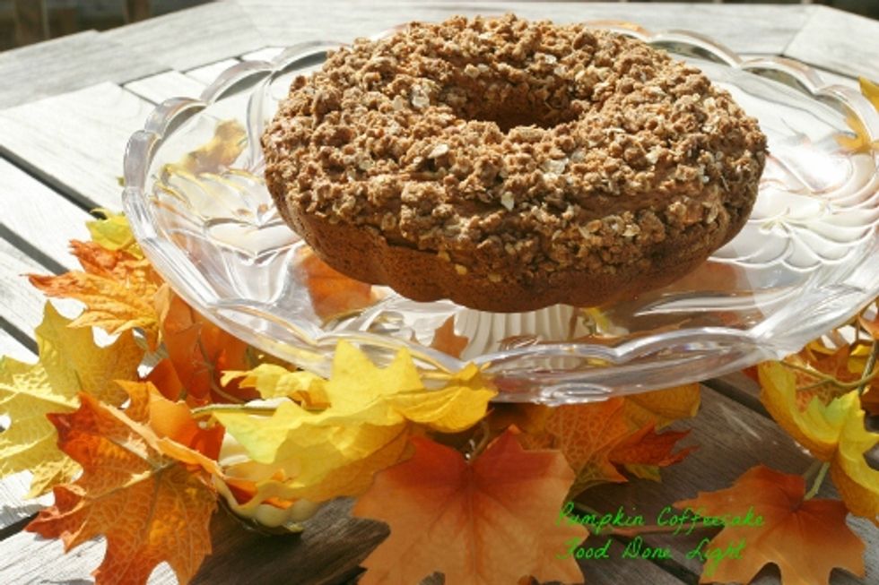 A lightened pumpkin coffee cake with a streusel topping
