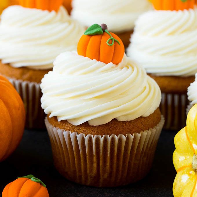 These pumpkin cupcakes are filled with pumpkin puree and spices, then baked and topped with a generous amount of cream cheese frosting. The ultimate fall treat that's perfect for parties and even for Thanksgiving day.