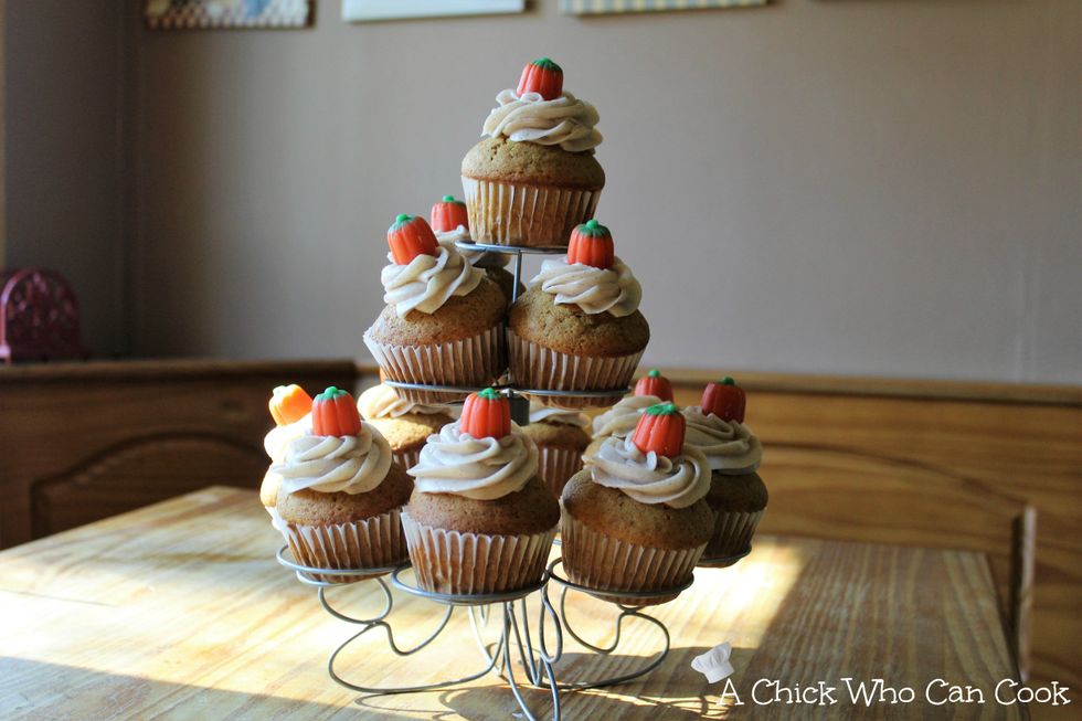 Fall is a few days away and I am ready for it! 65* here today so why not some amazing pumpkin cupcakes with a simple cream cheese cinnamon frosting.