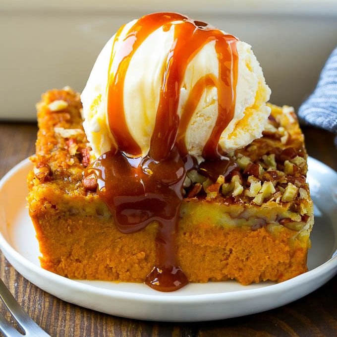 This pumpkin dump cake is a creamy pumpkin pie filling topped with a decadent pecan butter cake. Serve with ice cream on top for the perfect end to any fall dinner or holiday meal.