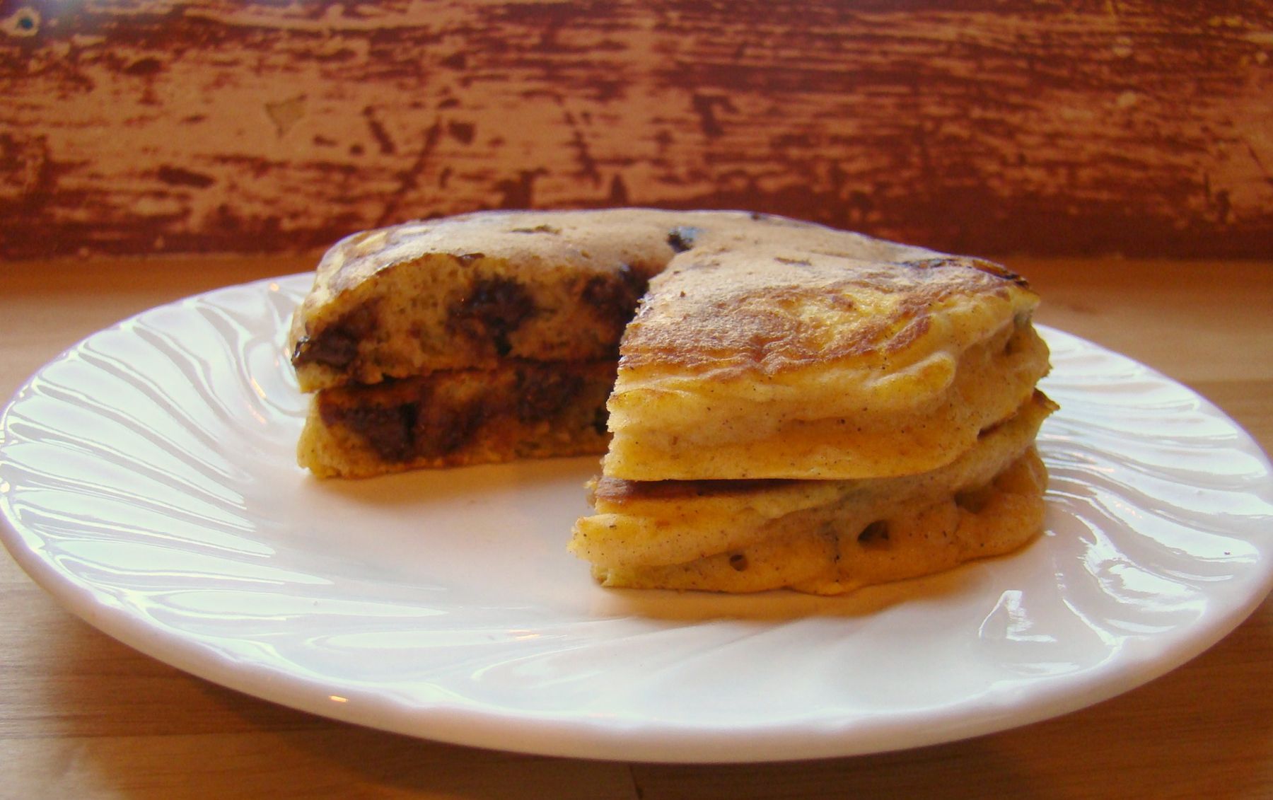 These fluffy little pancakes take just a bit longer to cook than the usual pancakes. Totally worth the wait! We usually just eat them plain because they are so good. The leftovers are really good for an afternoon snack just cold out of the fridge! For us, anything with pumpkin and chocolate chip is a win.