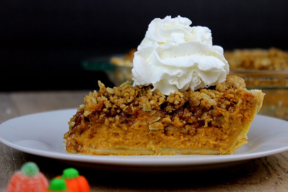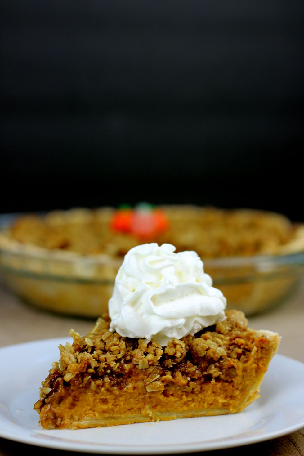 Pumpkin pie with dark brown sugar topped with a rich Pecan Streusel topping. Who says you need to choose pumpkin OR pecan pie?
