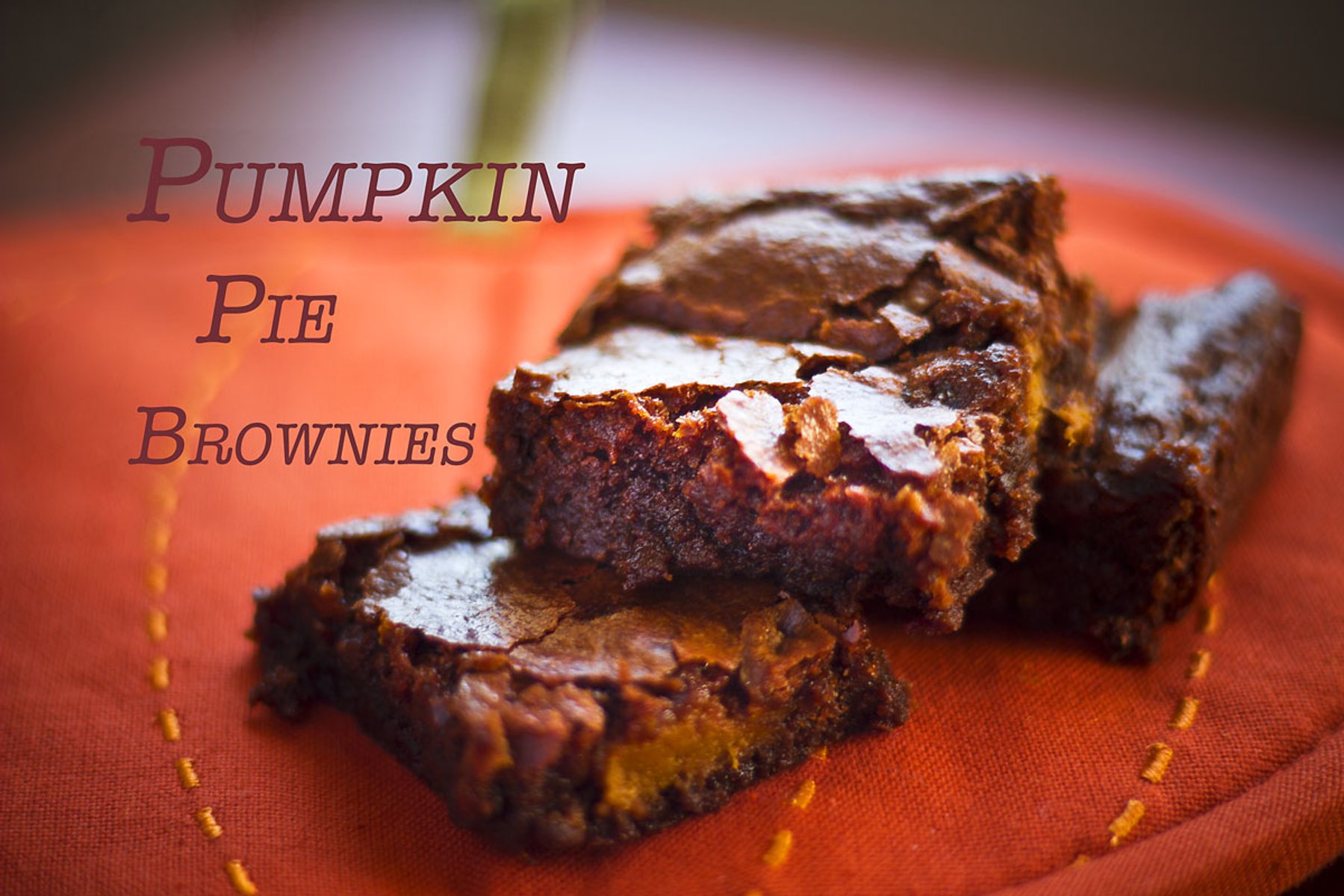 Pumpkin pie filling mixed into brownie batter to create chocolatey pumpkiny goodness.