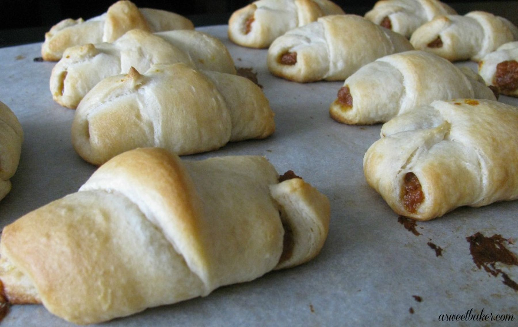 Spread a spoonful (or more) of pumpkin mixture onto the wide end of the crescent roll and roll up, leaving the tip of the triangle face-up.