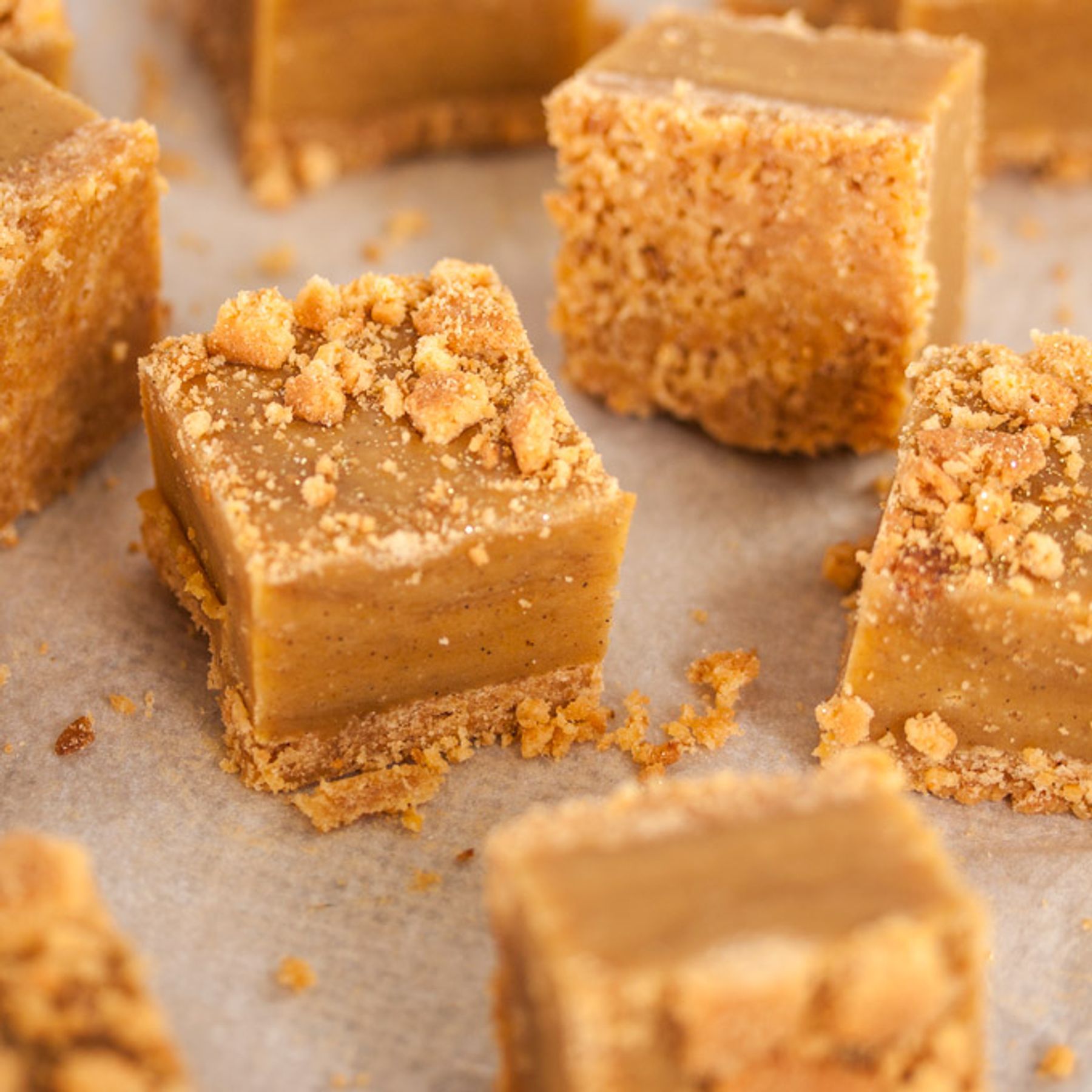 Pumpkin Pie Fudge. The cosy flavours of autumn in a silky, smooth fudge with a crunchy no-bake biscuit base.