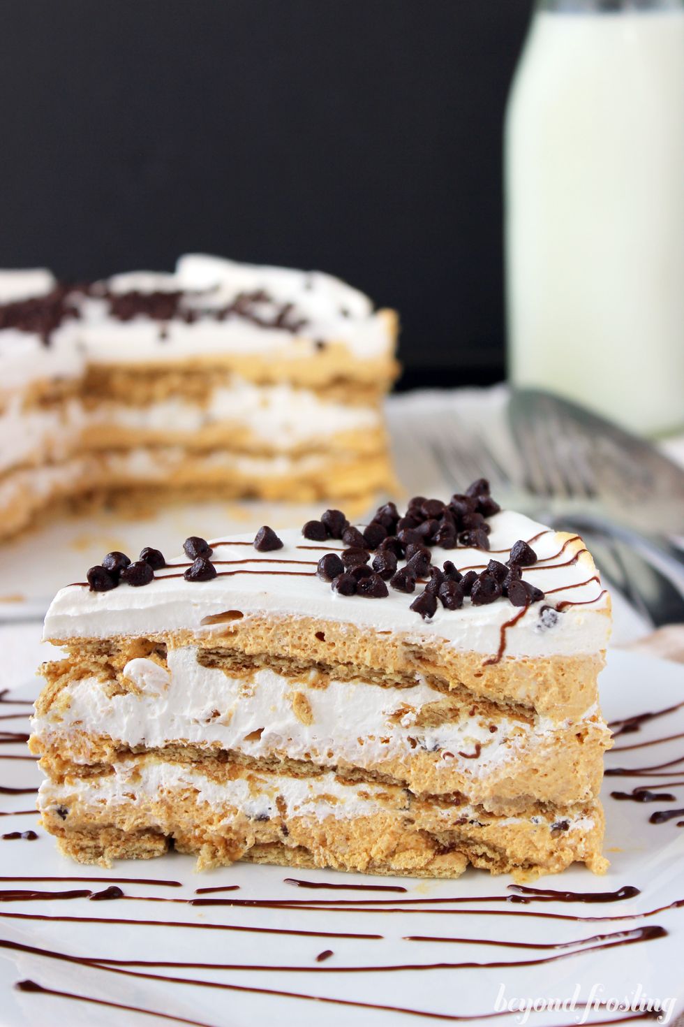 This pie is layered with graham cracker, pumpkin mousse and whipped cream.
