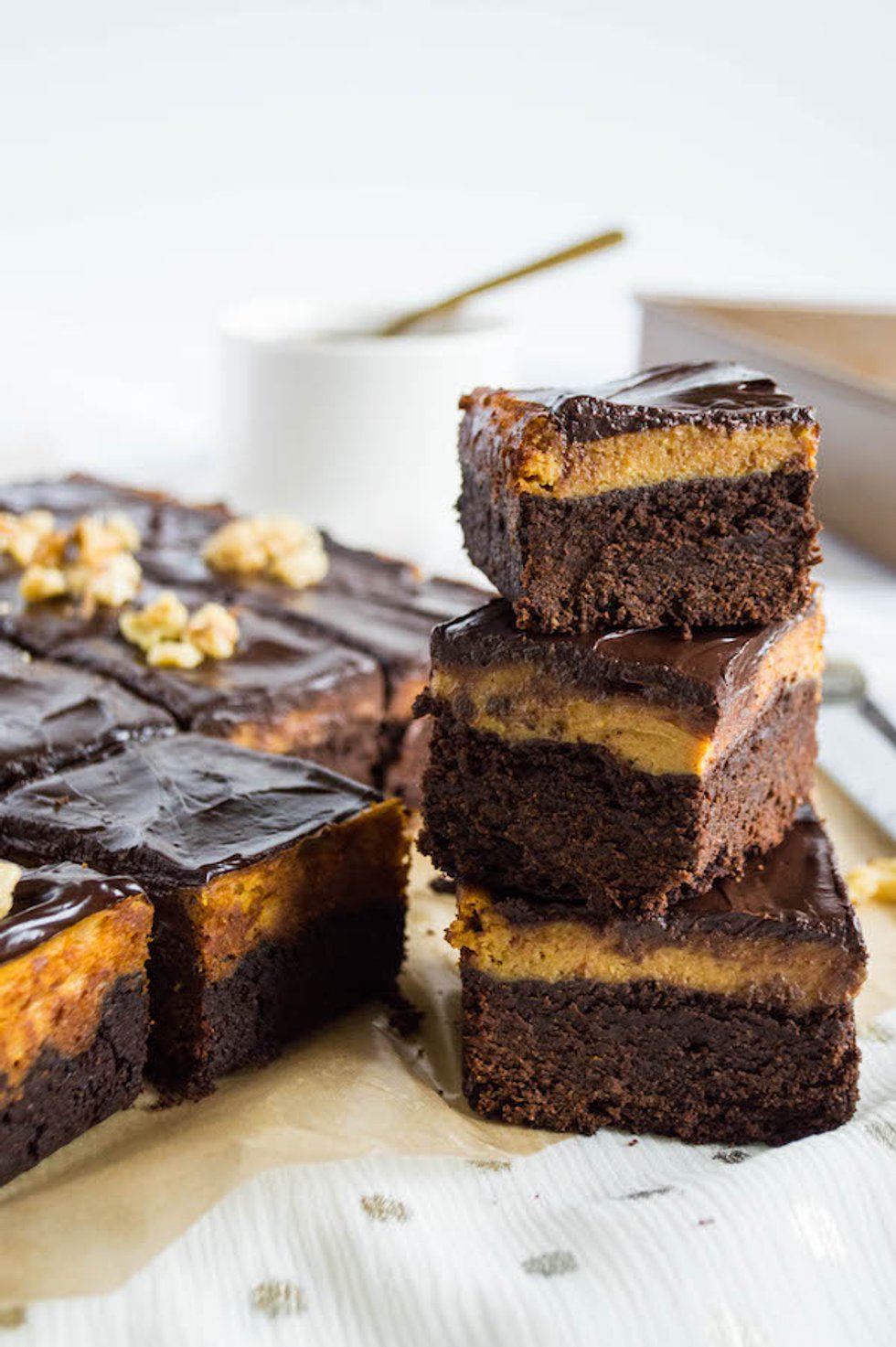 Pumpkin Pie Brownies; Super rich and decadent brownies topped with a pumpkin pie layer. Serve them at your Halloween Party or Thanksgiving Dinner!