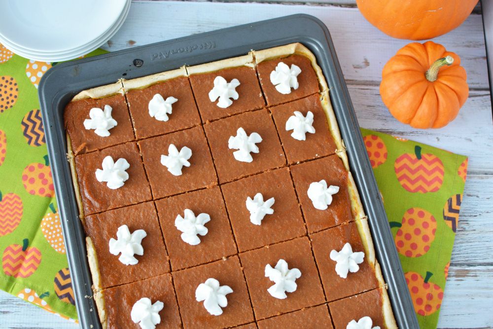 Pumpkin pie squares are an excellent holiday dessert option for larger crowds. Where a traditional pumpkin pie can serve about six people, this pumpkin slab is cut into at least twenty-four slices. It's up to you how you cut the servings of this pumpkin pie slab. Kari from Craft Create Cook made this recipe for us.
