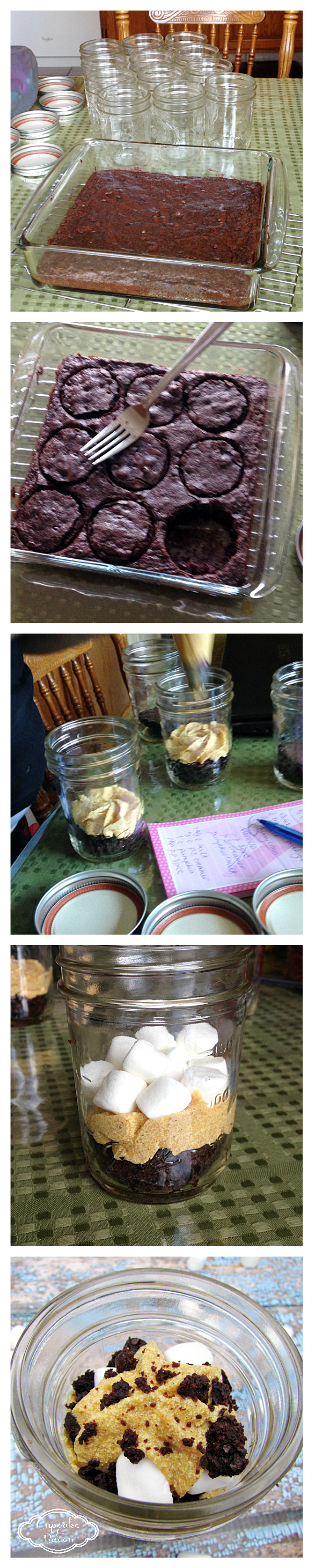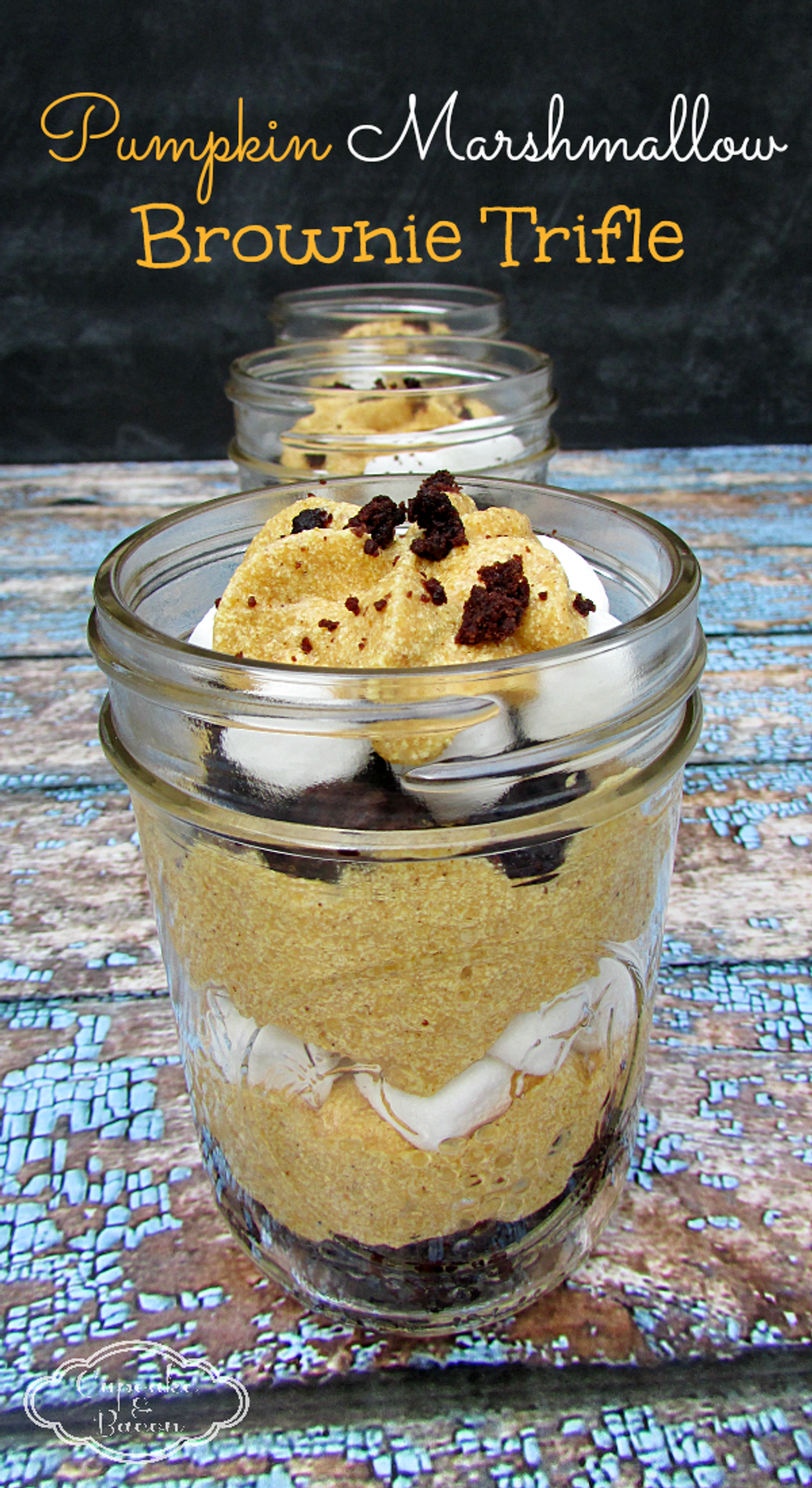 Cute, mini pumpkin pie trifles in a jar! Made with brownies, pumpkin mousse, and marshmallow.