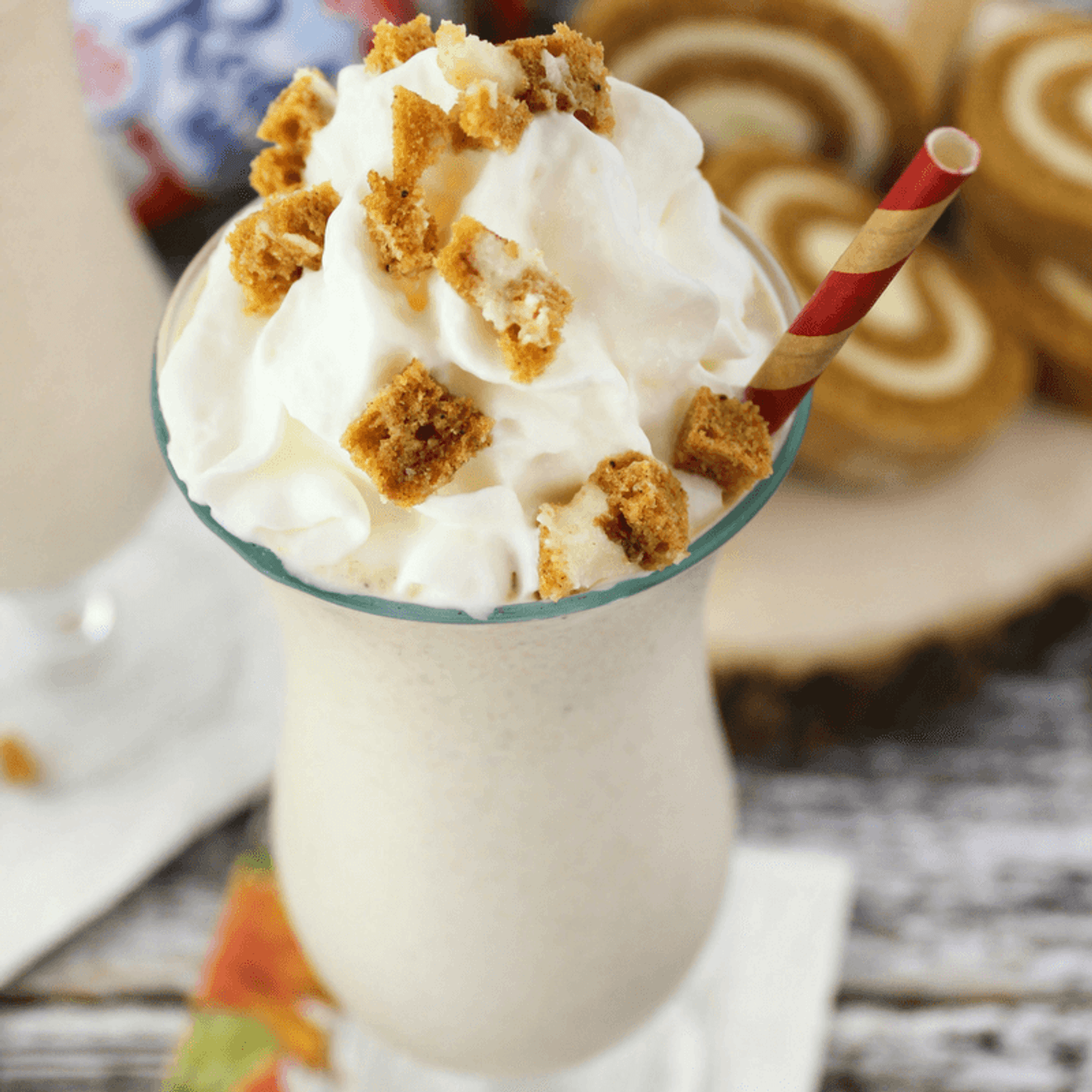 Pumpkin Roll Milkshake made with vanilla ice cream, pumpkin spice seasoning, a slice of delicious The Bakery at Walmart Pumpkin Cake Roll with Cream Cheese Filling and a dollop of cold Reddi–wip®.