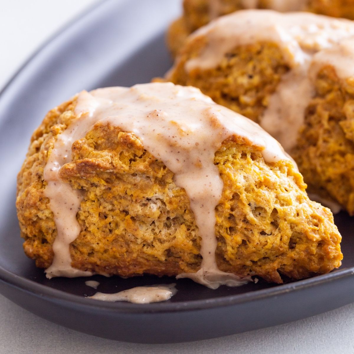 These moist pumpkin scones are crisp on the outside and soft on the inside – just the way a good scone should be. Each one is loaded with cozy cinnamon, ginger, nutmeg, and cloves.