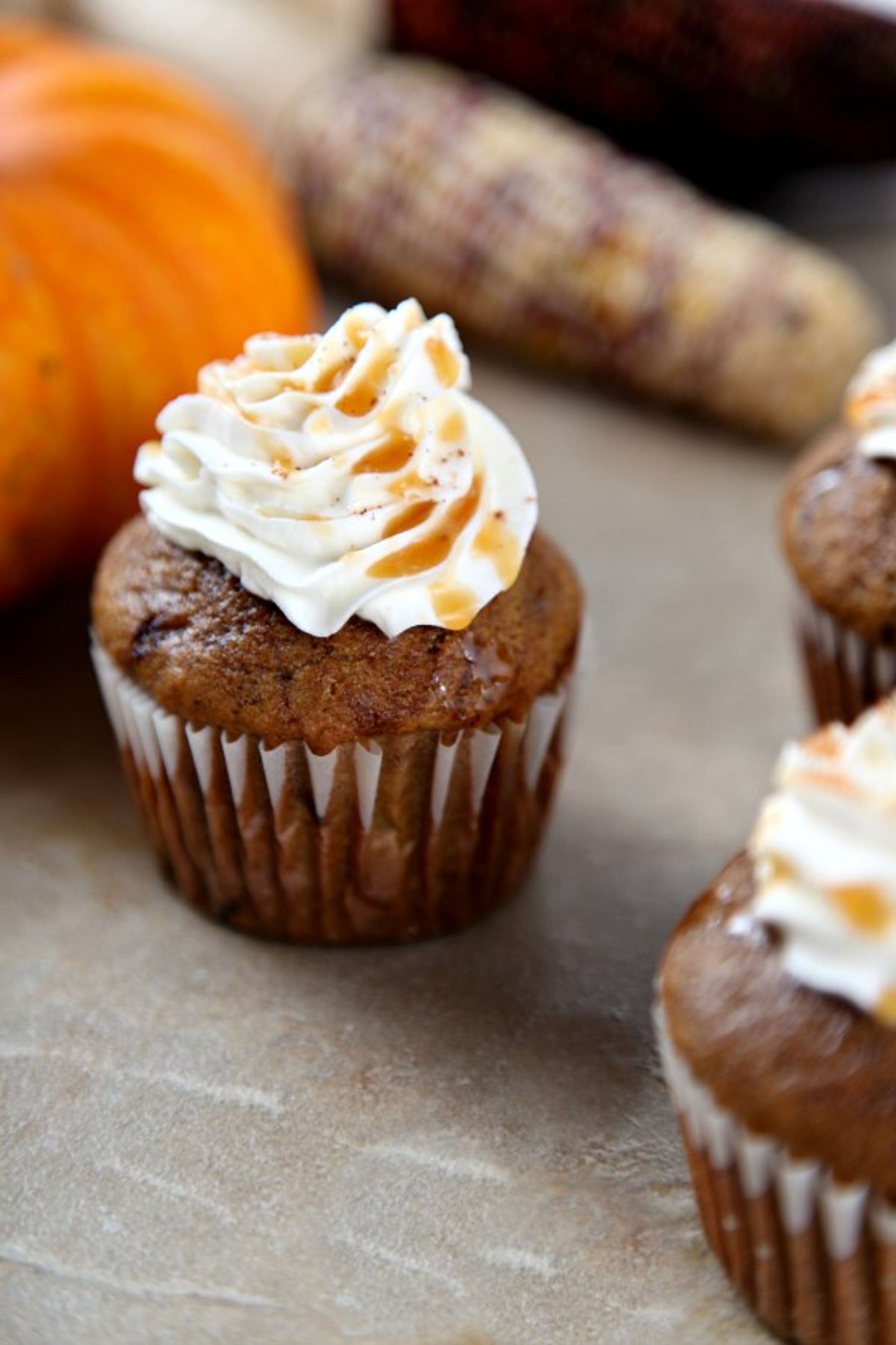 Pumpkin Spice Cupcakes: Tender pumpkin spice cake topped with sweetened whipped cream and a decadent caramel drizzle.