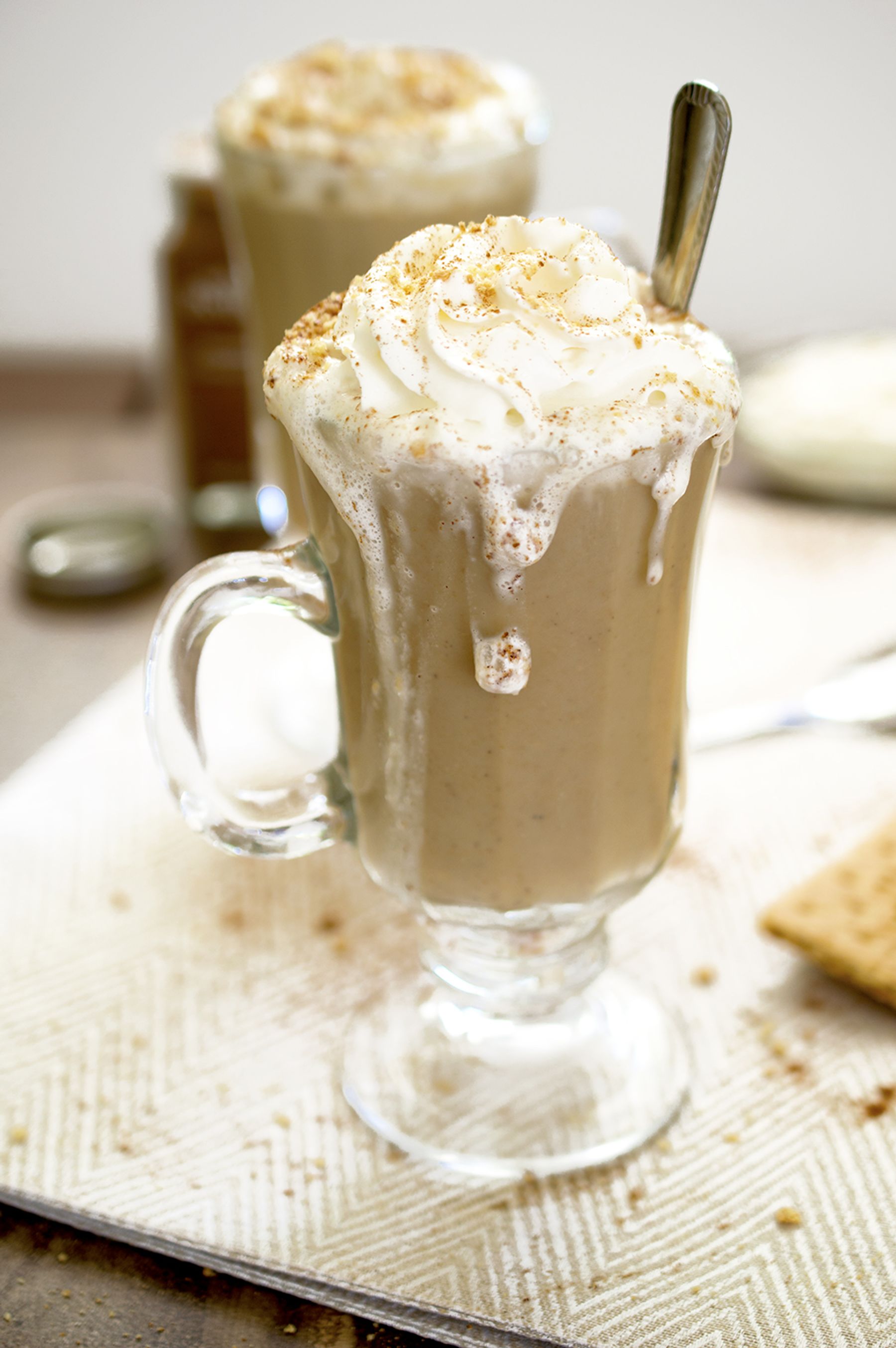 Garnish with whipped cream, cinnamon, and graham cracker crumbs.