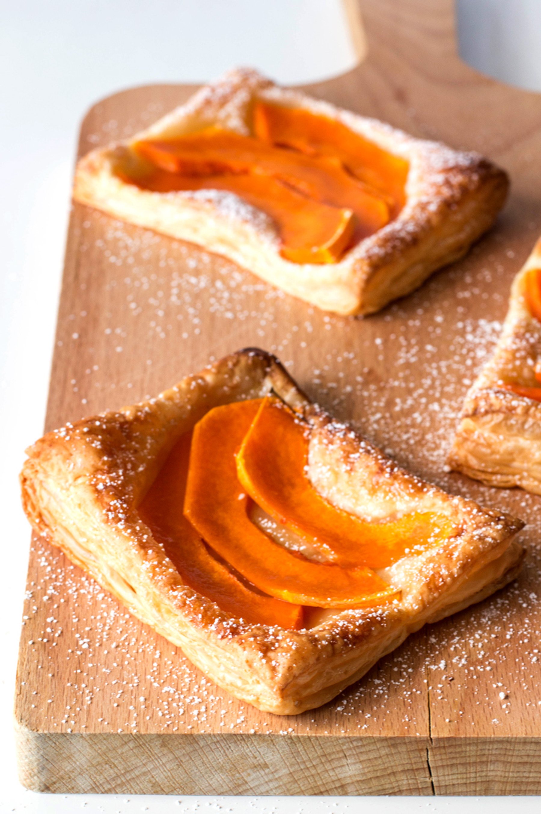 Cut the butternut squash into thin slices. Cut the puff pastry into four even rectangles to fit the pumpkin slices. Brush with maple...